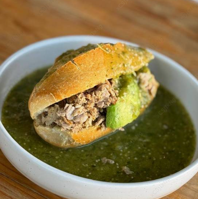 Lonche bañado en salsa verde con aguacate.