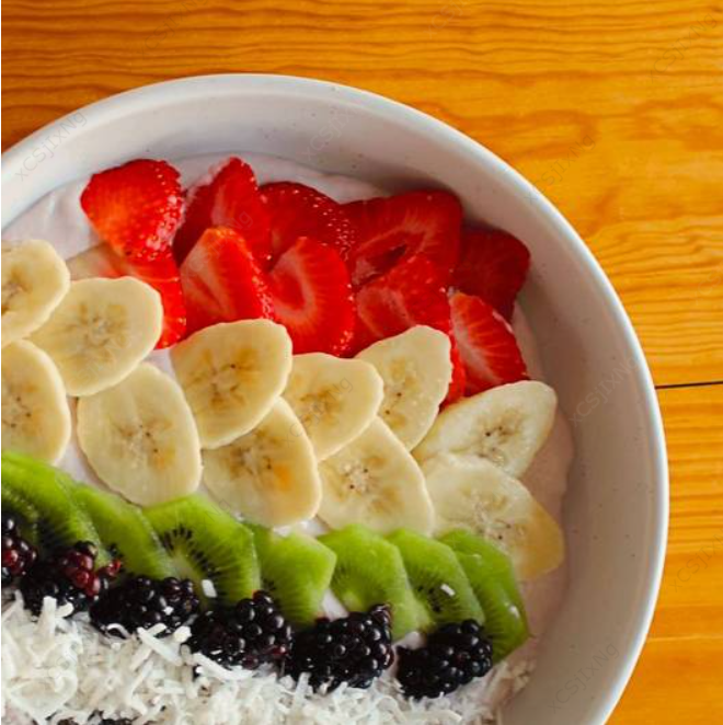 Mezcla de yogurt Griego con açaí, plátano y zarzamora. Acompañado de kiwi, fresa, plátano, coco rallado y chía.