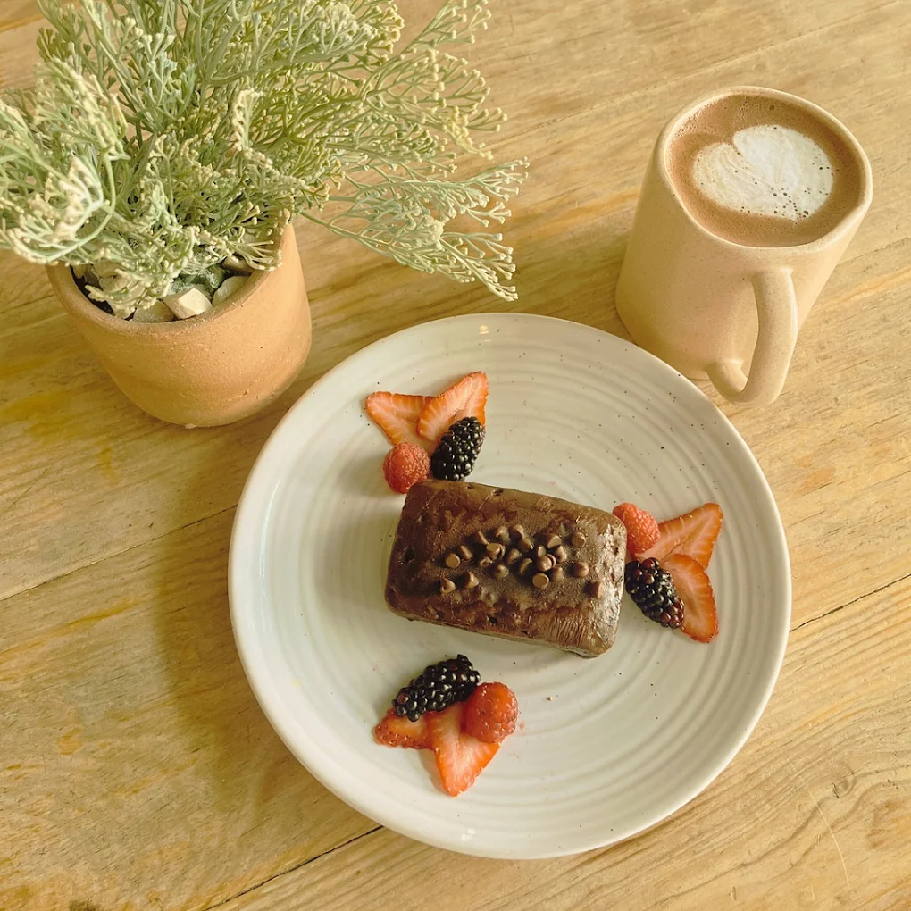 Pastelito de harina de almendra relleno de jalea de fresa y crema batida, bañado en chocolate oscuro, acompañado de frutos rojos. 0% azúcar 0% carbs.