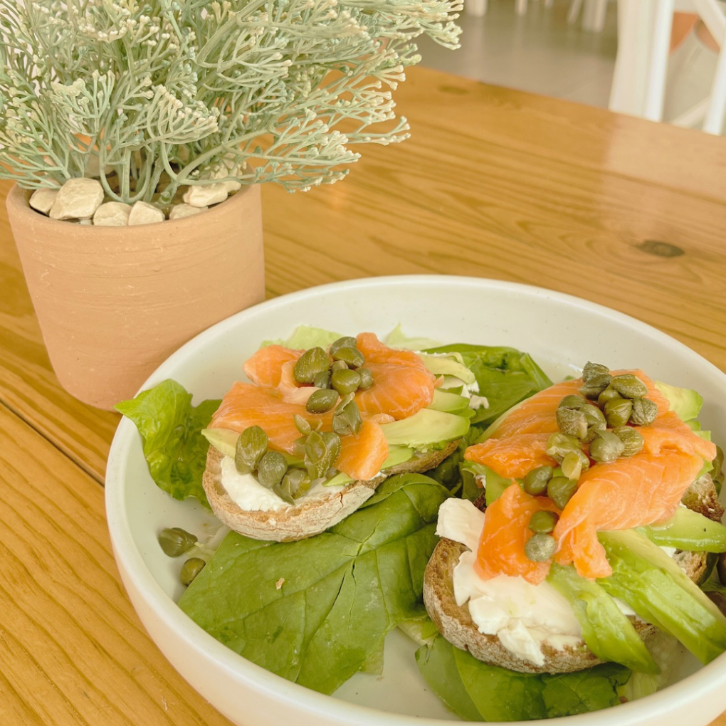 Láminas de salmón ahumado, queso crema, alcaparras y aguacate, sobre hogaza de pan de masa madre montados sobre cama de espinaca.
