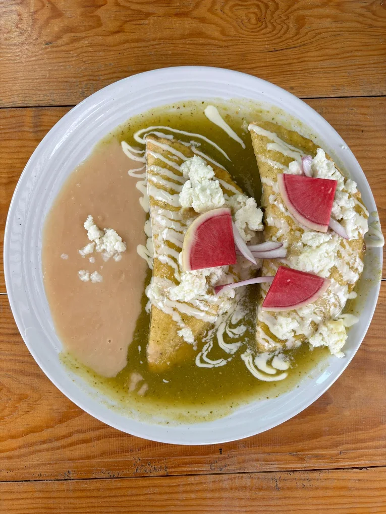Orden de 2 piezas, iguales o combinadas, masa de maíz blanco, mix de quesos (mozzarella, adobera y Oaxaca), salsa verde o roja, crema acompañados de frijoles refritos y queso de mesa.