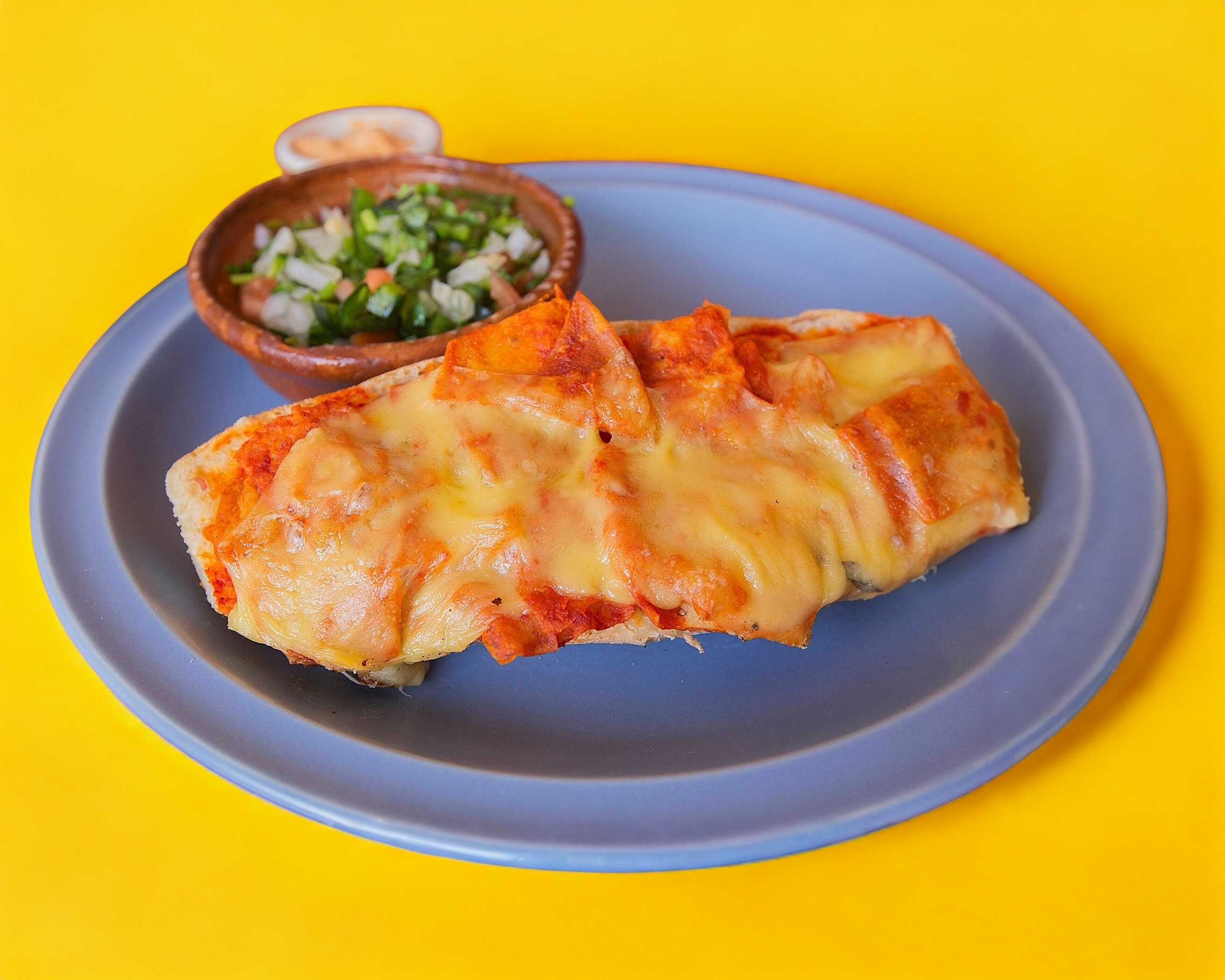 Sin duda uno de los platillos estrella, con pan artesanal elaborado en casa con queso gratinado, se acompaña de papas y ensalada.