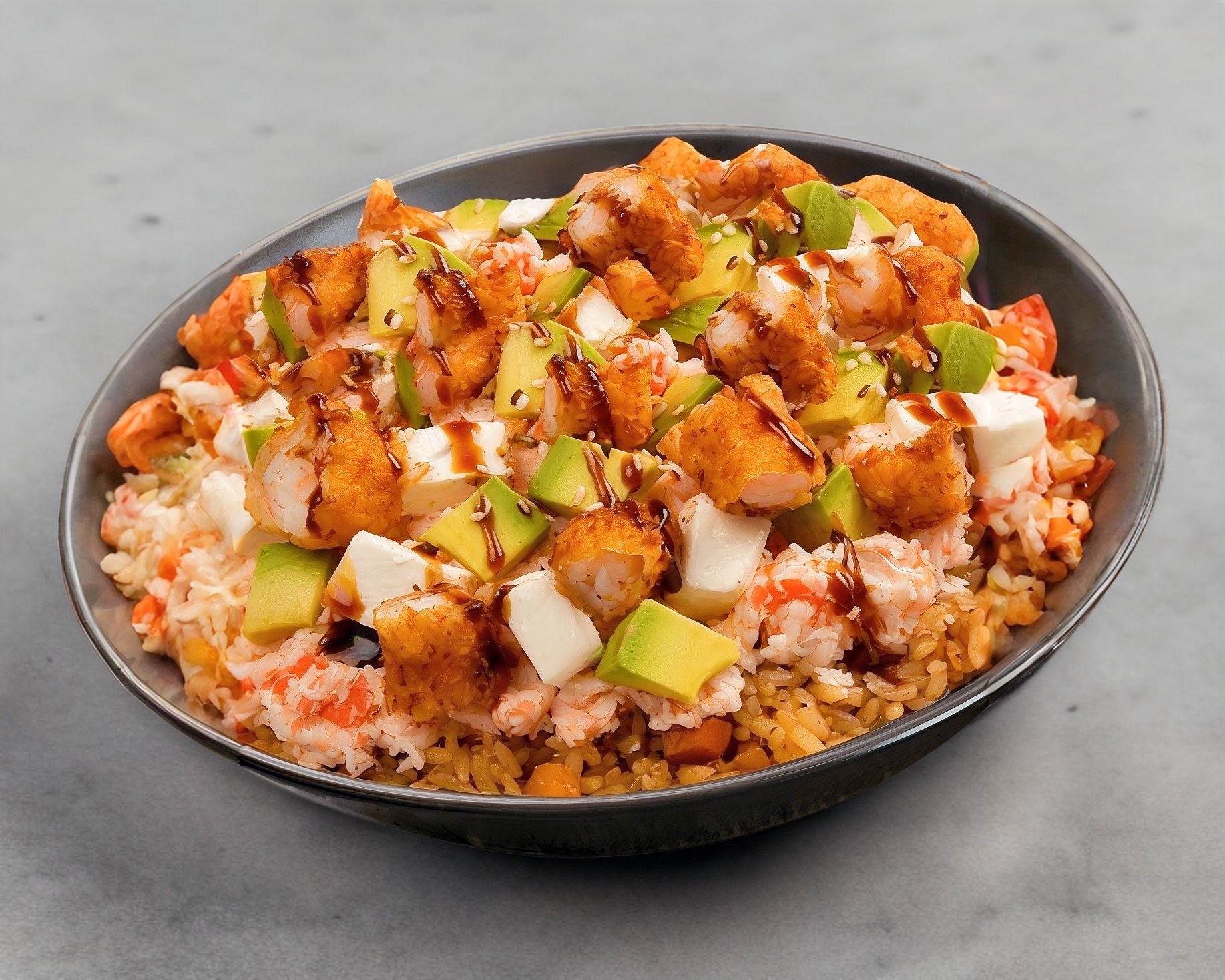 Arroz frito vegetariano cubierto con ensalada de cangrejo fresca, queso crema philadelfia, aguacate y camarones roca muy crujientes 1kg