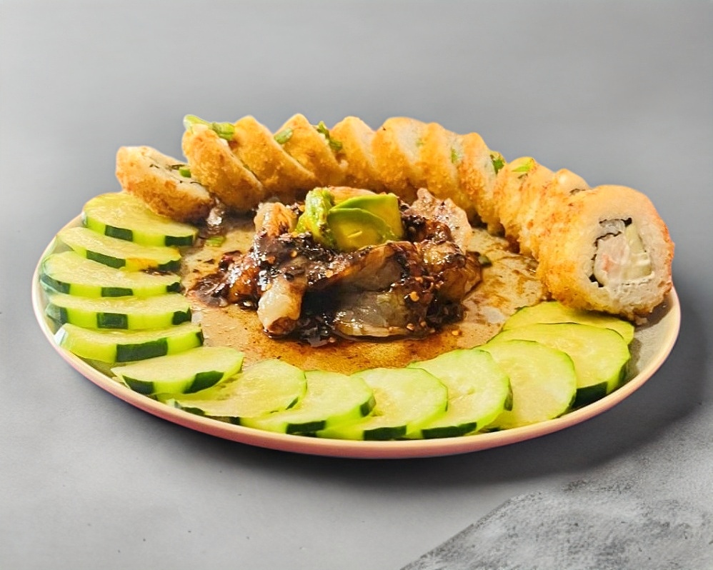 Chesse roll, rollo relleno de queso crema philadelphia, aguacate, pepino, neggy, arrachera, empanizado en crujiente panko y cubierto de un fondue de 3 quesos. 10 a 12 pz