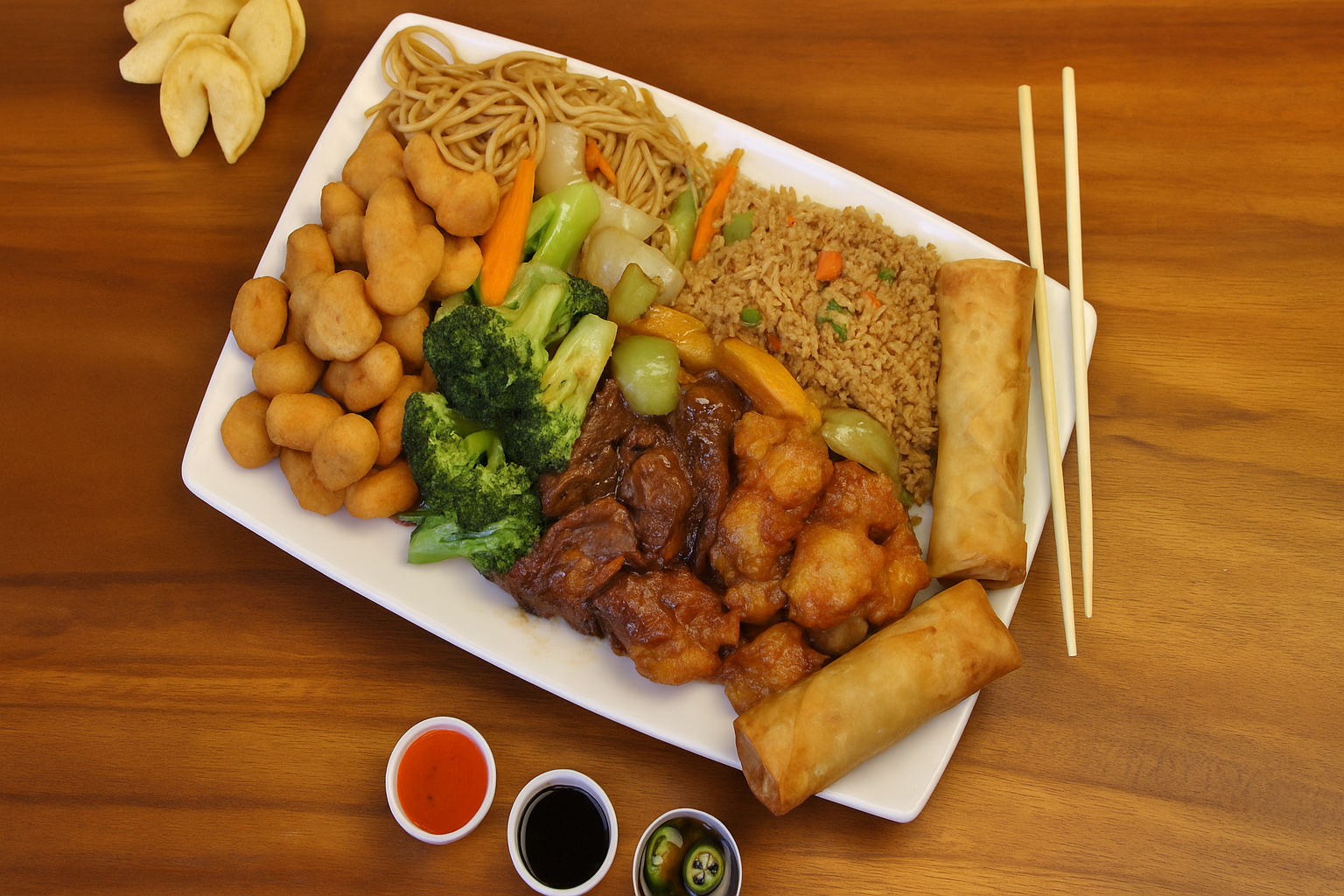 Arroz frito y espagueti más 3 guisados más 3 rollos primavera.
