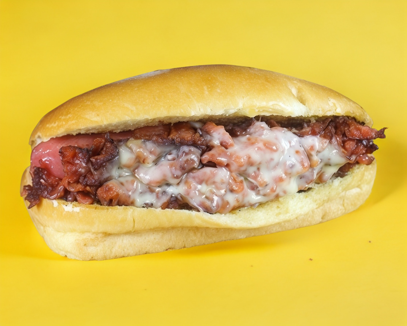 El amigo de pepe. Salchicha de pavo envuelta en tocino, chorizo y queso gouda derretido.