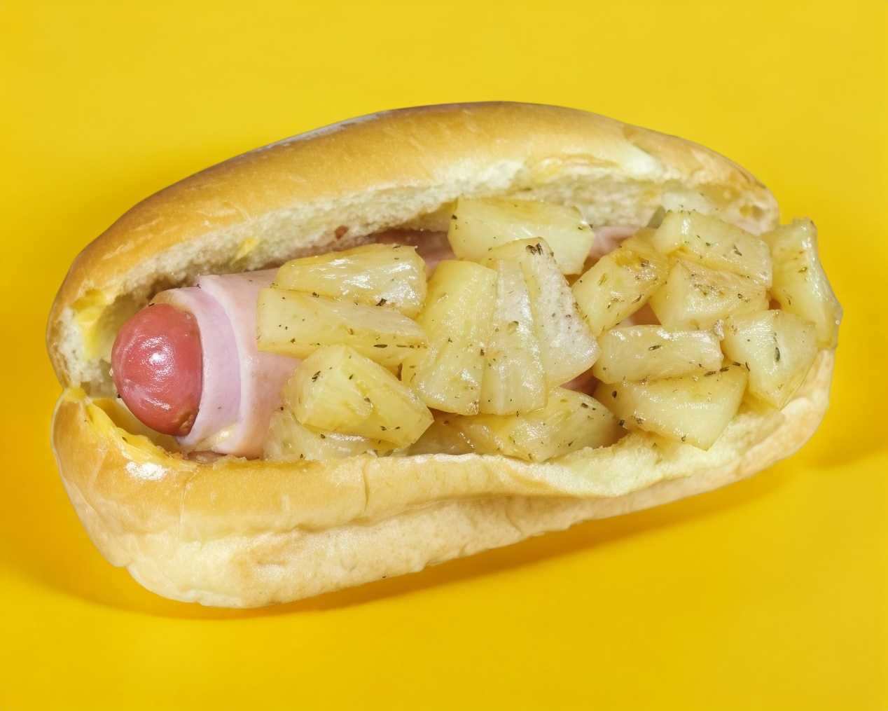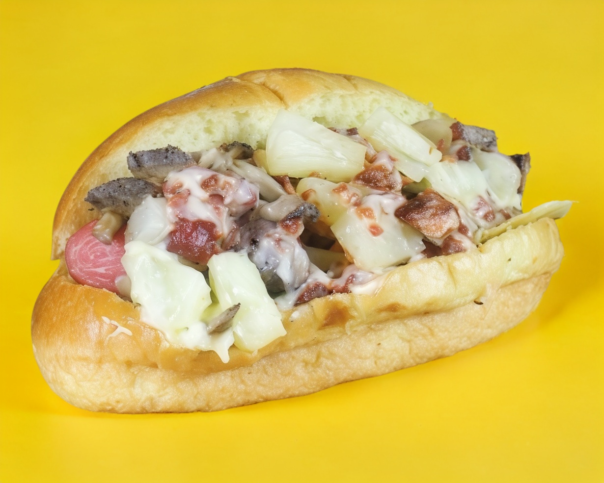 Con uno tienes... O tal vez dos! Salchicha de pavo envuelta en tocino, champiñon, piña, chorizo y queso gouda derretido.