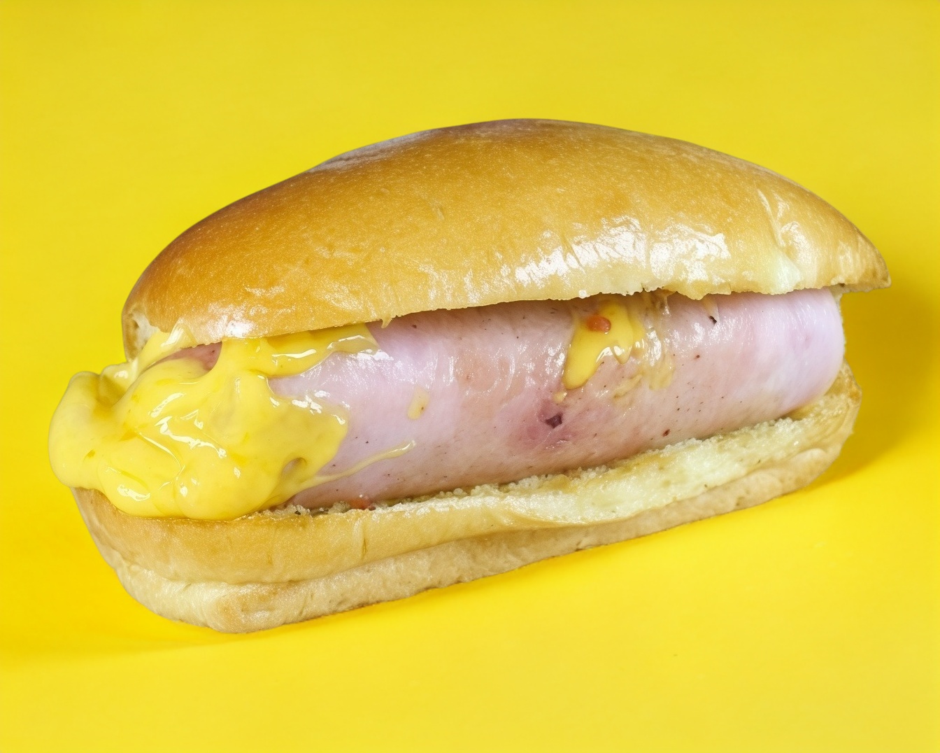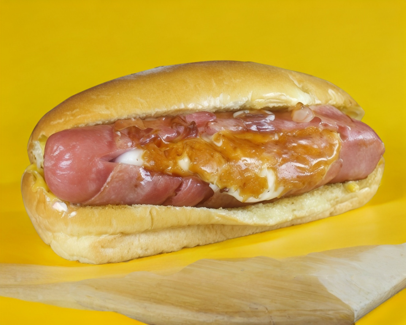 Si te quedó el saco, pidete uno. Salchicha de pavo gruesa envuelta en tocino y rellena de queso, acompañada de jitomate, cebolla, mostaza y cátsup aparte..
