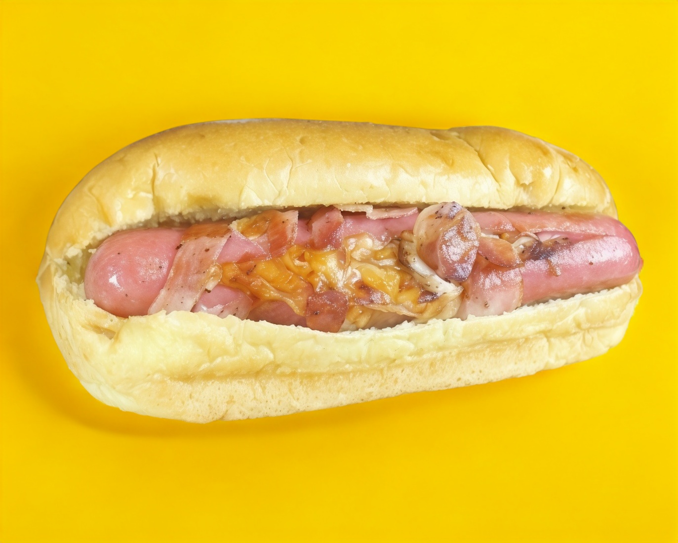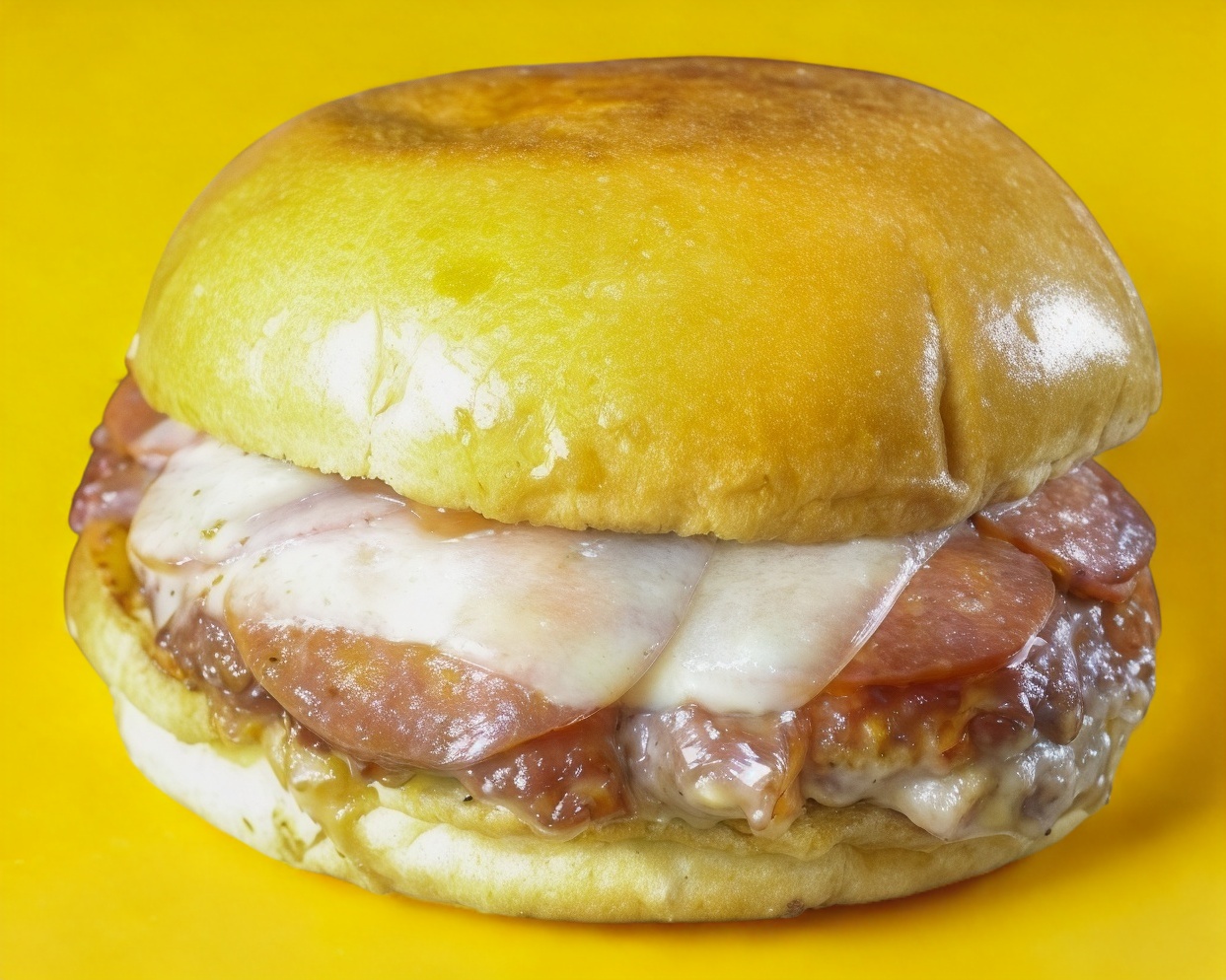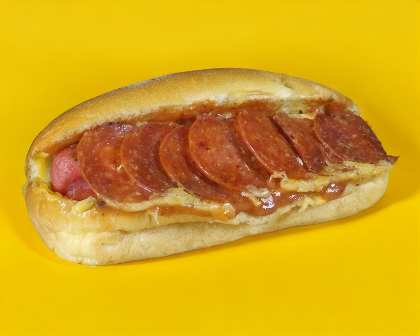 Magnífico! Salchicha de pavo envuelta en tocino, salsa de pizza, Pepperoni y quso gouda derretido.