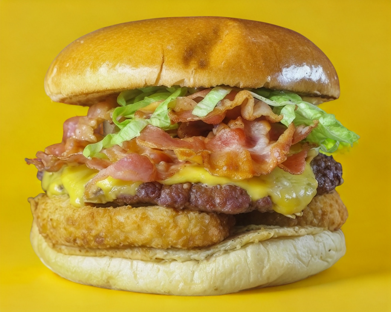 Llegó para quedarse. Carne de res 130 gramos , aros de cebolla, tocino y queso amarillo.