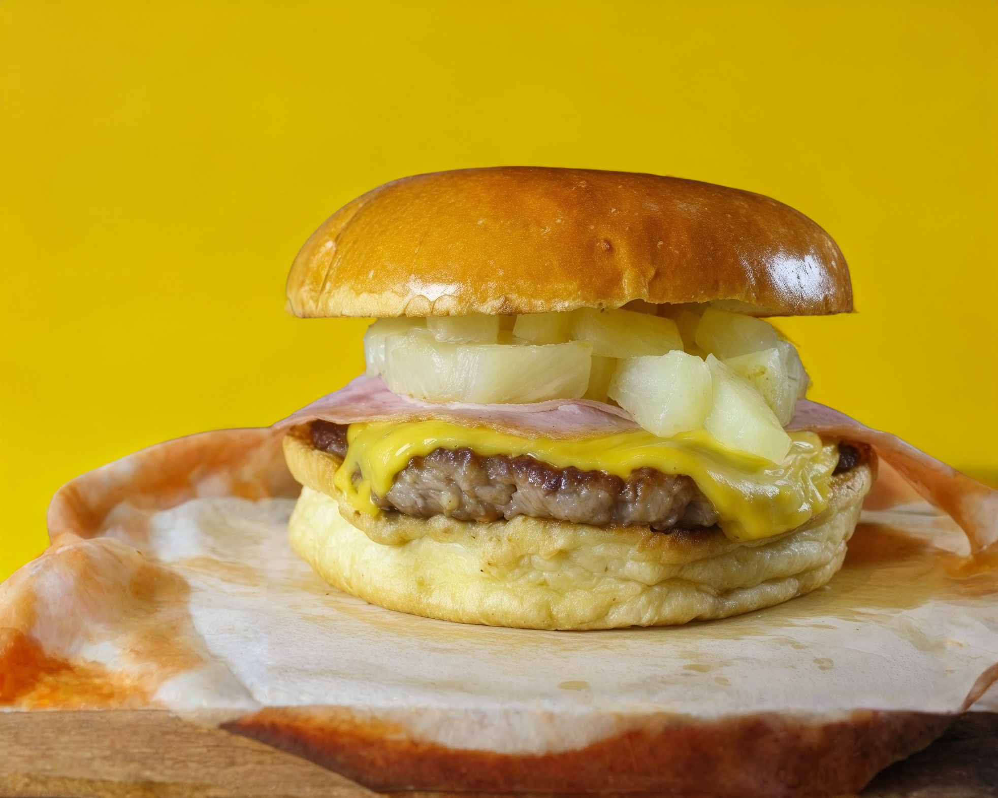 La burger personal estelar, y no, no tiene madre. Trae Carne de res 100 % aprox. 130 gr , piña, chorizo, champiñon, jamón, queso amarillo y queso blanco derretido.