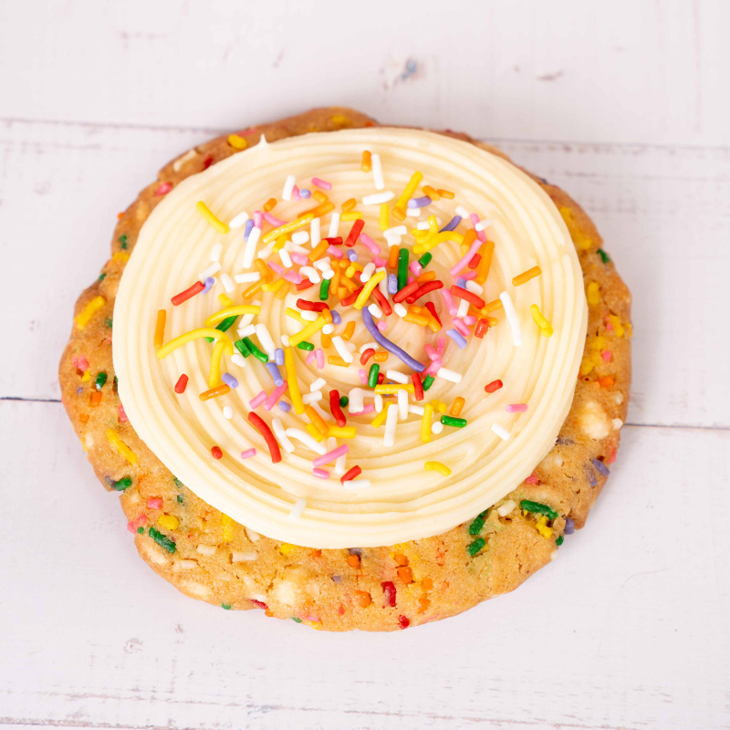 ¡Un festín de sabor! Galleta a base de chocolate blanco y chispas de chocolate, con un topping de Vainilla y granulado de colores