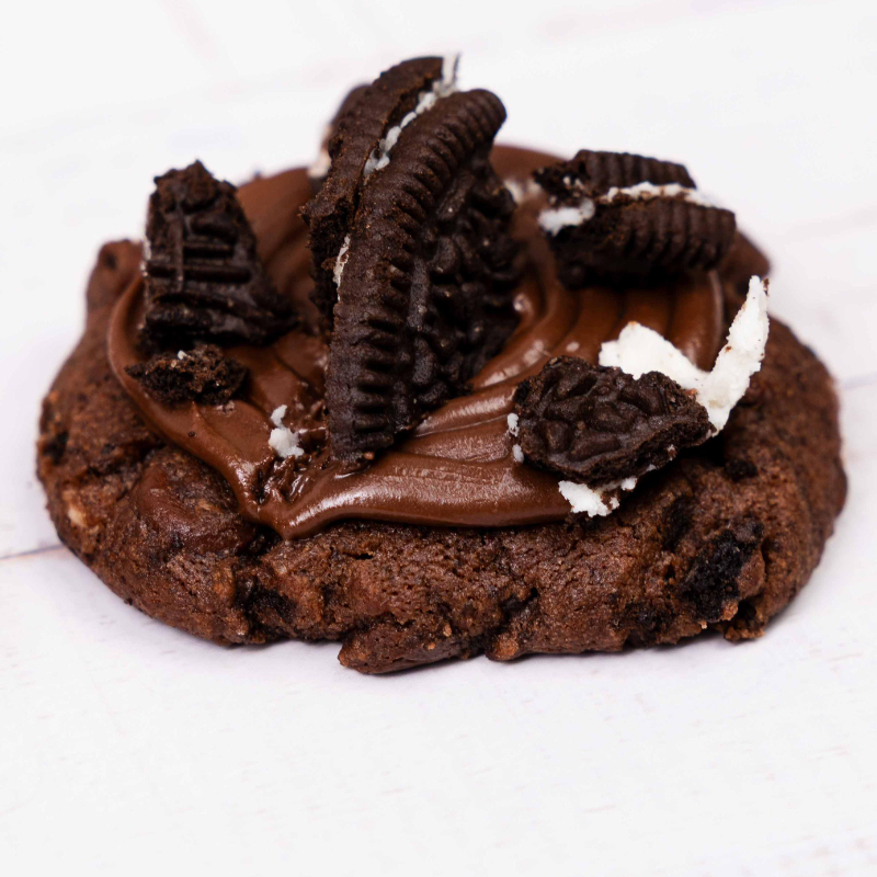Galleta a base de chocolate Hershey´s , chispas de chocolate, trozos de galleta, topping de mas chocolate y coronada con la infaltable Oreo, ¡una explosión de sabor!
