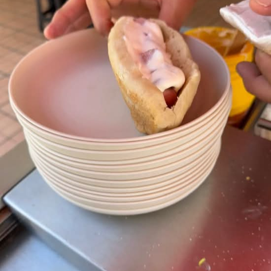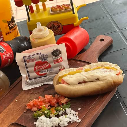 Hot dog con doble salchicha cocida, cebolla, jitomate, chile verde, crema de la mejor calidad y mostaza.