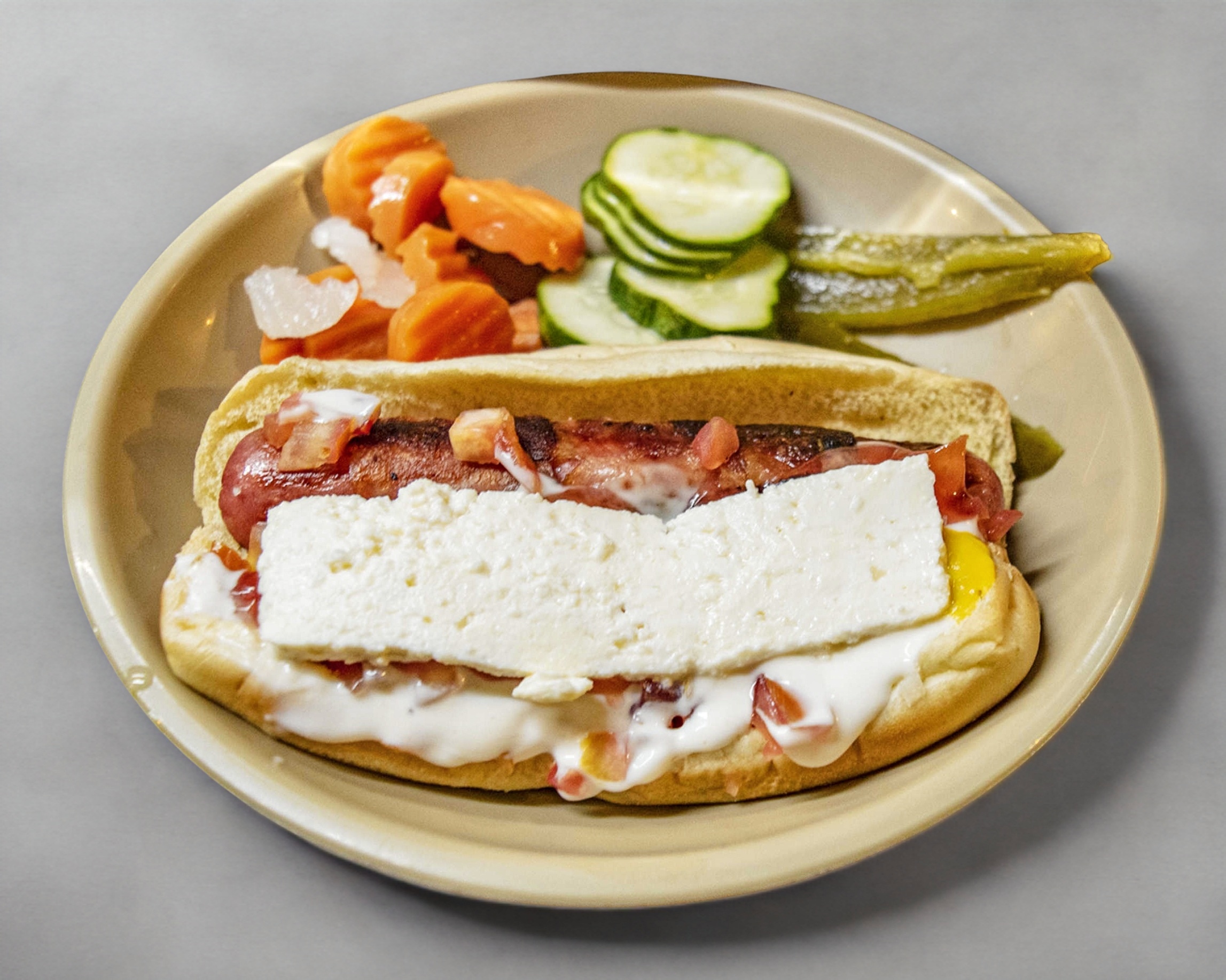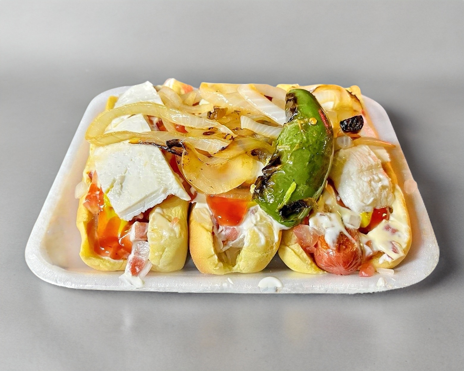 cebolla, jitomate, crema, mayonesa, catsup, mostaza panela, queso🌭