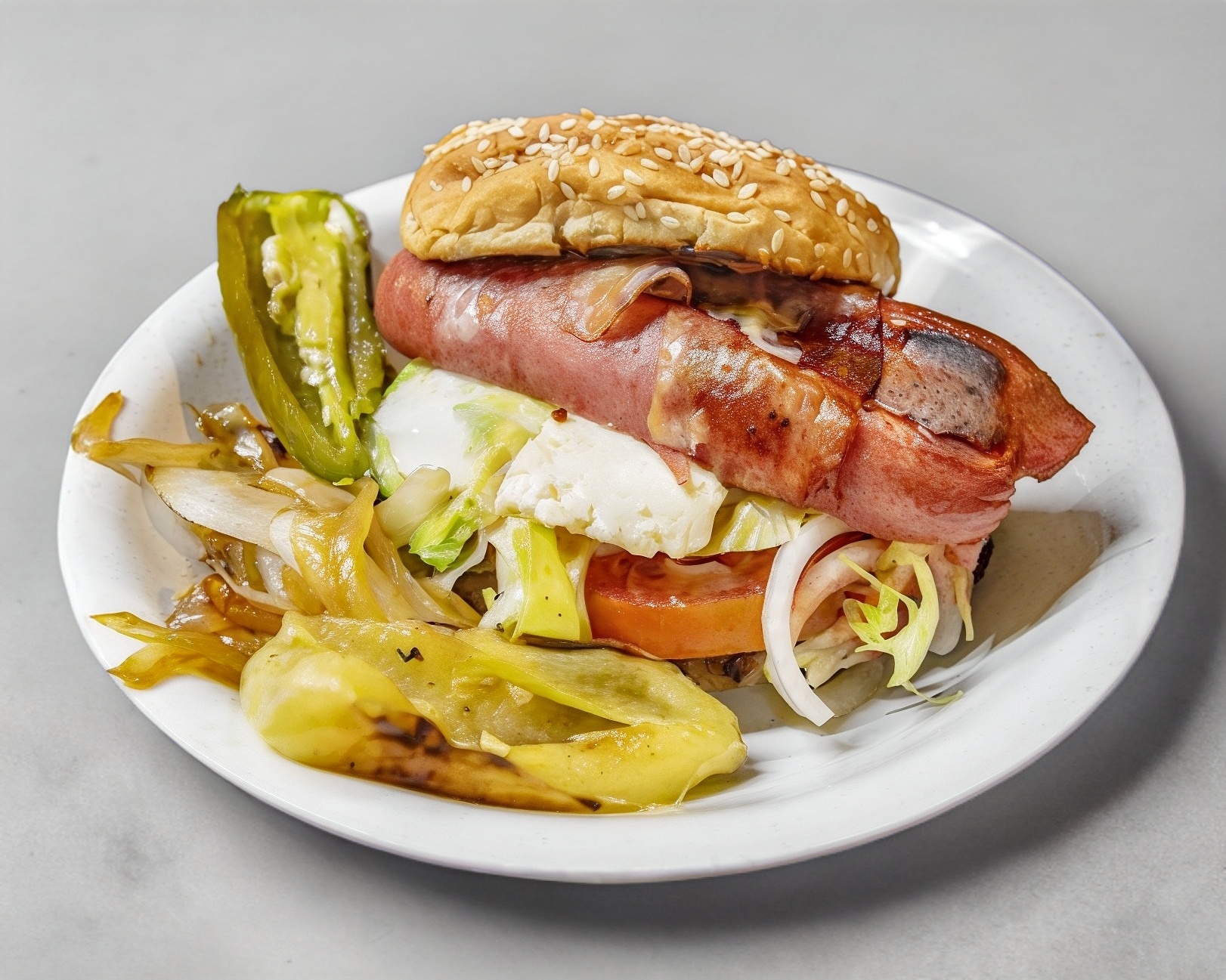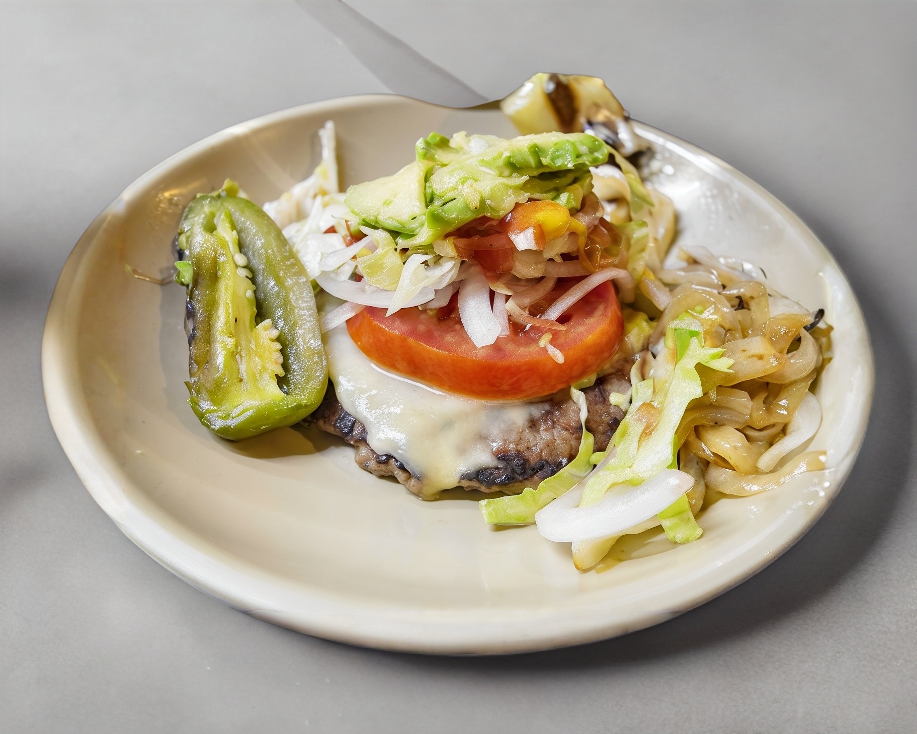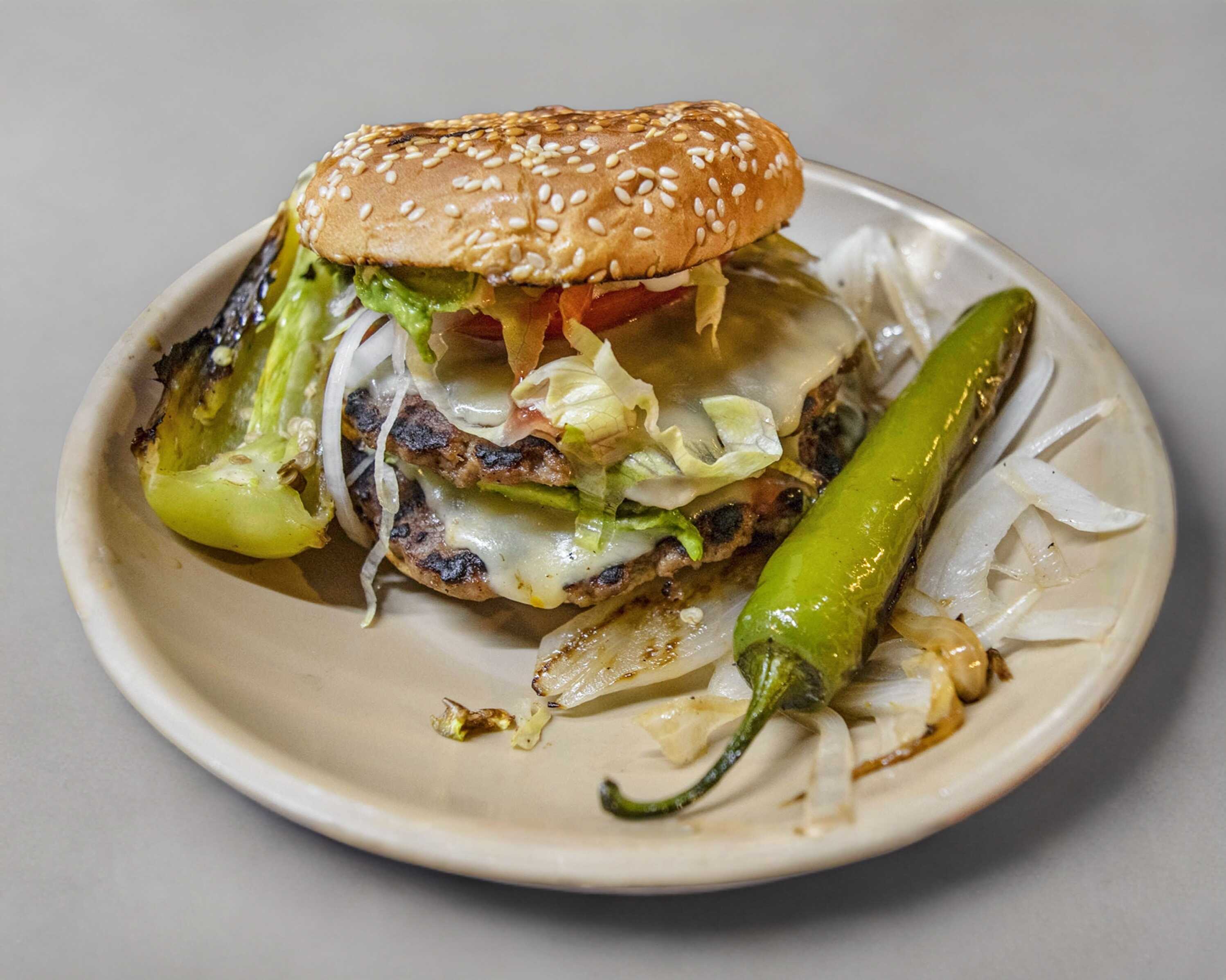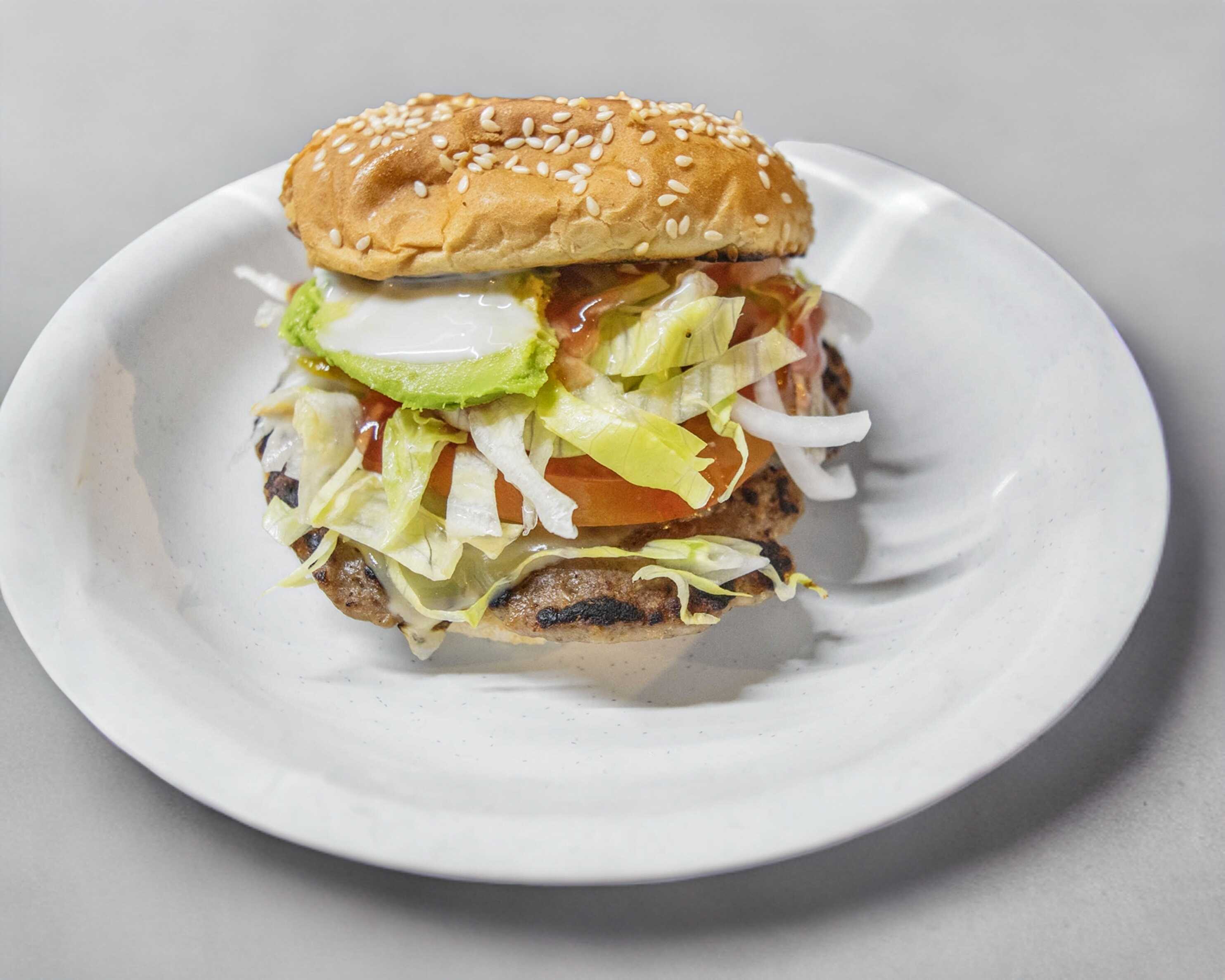 Queso manchego, cebolla, jitomate, lechuga, aguacate, crema, mayonesa, catsup y mostaza (+ Rebanadas de panela + 1 Salchicha con tocino dentro de la hamburguesa)