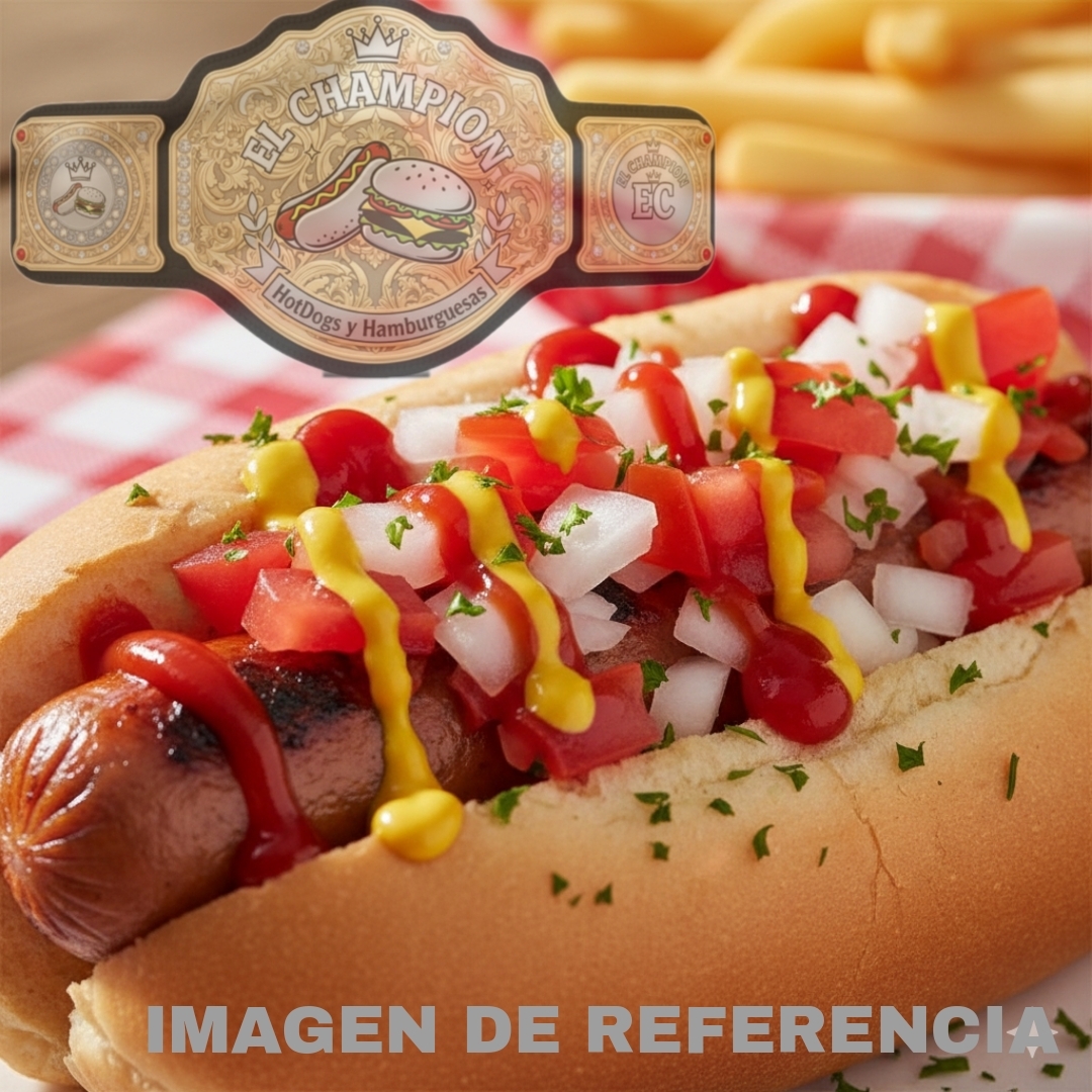 Hot dog Clásico servido con cebolla, jitomate, y sus clásicos aderezos