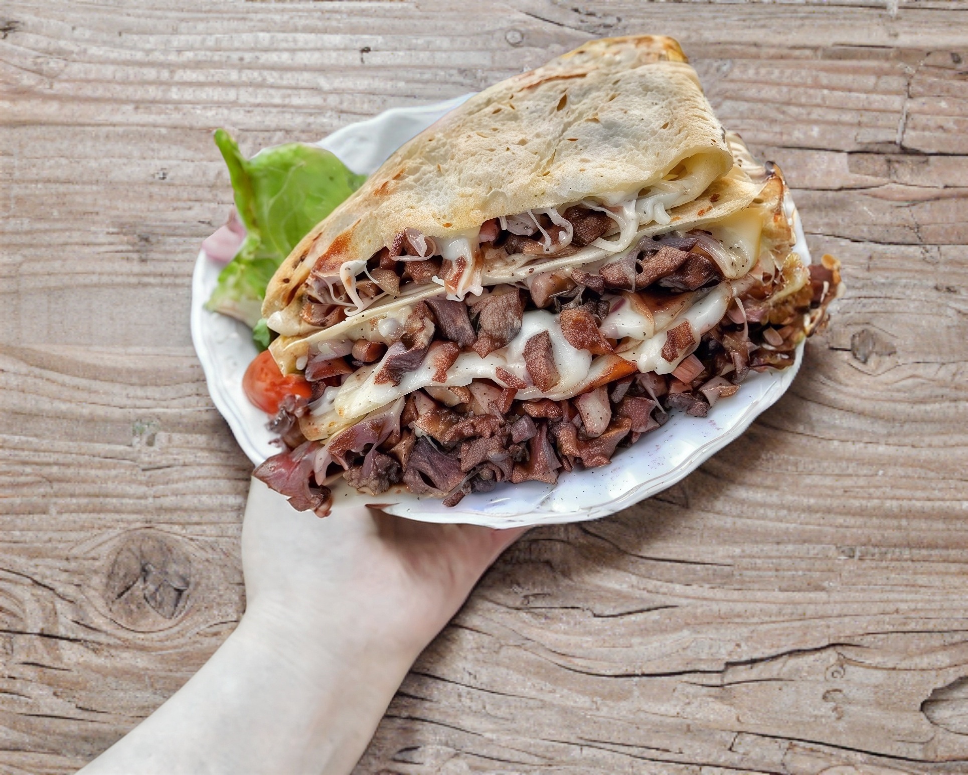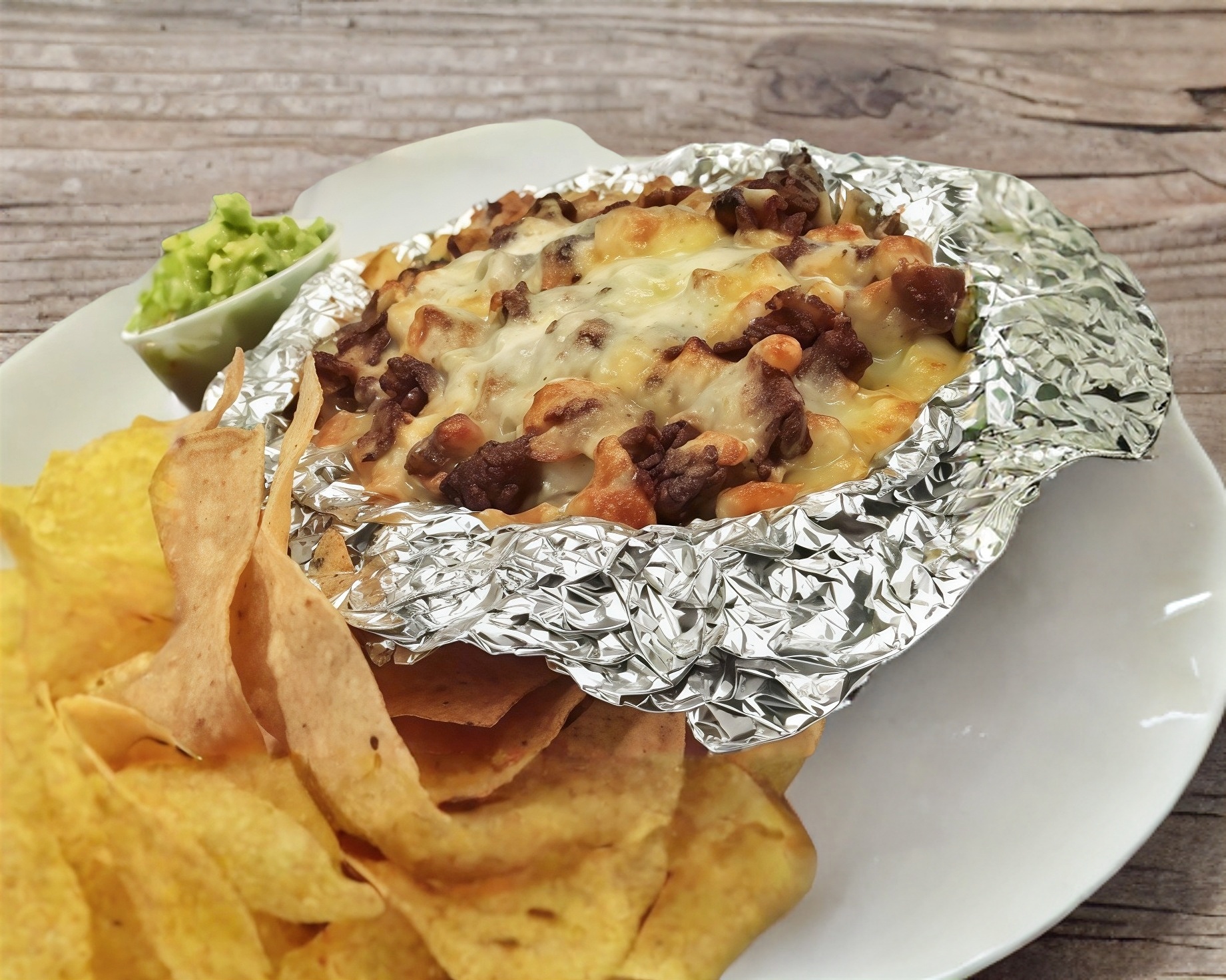 Tortilla grande con queso gatrinado y compañado de la proteina de tu eleccion acompañado de cilnatro cebolla y chile de la casa (verdura se sirve por separado).