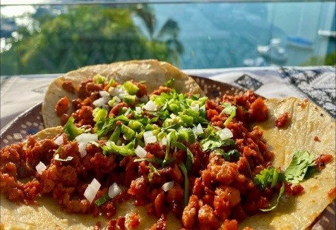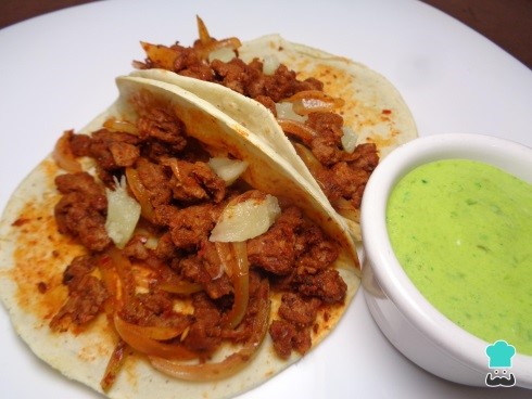Tortilla grande con pastor acompañado de cilnatro cebolla y chile de la casa (verdura se sirve por separado).