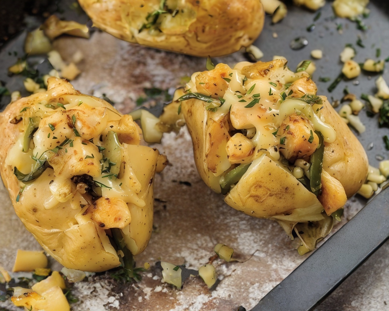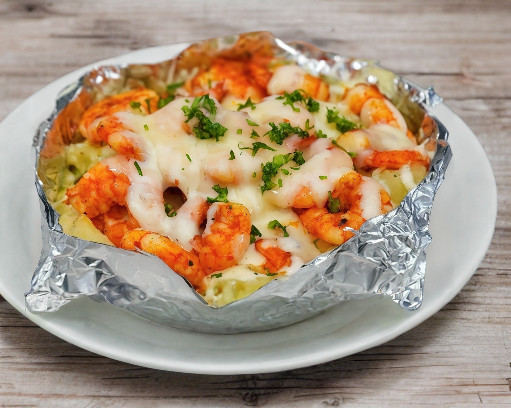 Papa rellena de camarones, asada y pollo con queso gratinado acompañado de un delicioso aderezo y cebollín (aderezo y cebollín se sirven por separado).