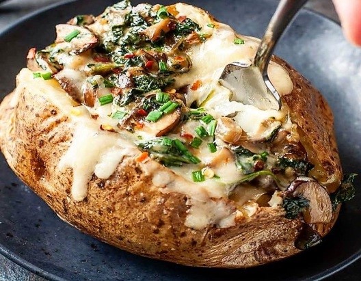 Papa rellena de champiñones con queso gratinado acompañado de un delicioso aderezo y cebollín (aderezo y cebollín se sirven por separado).