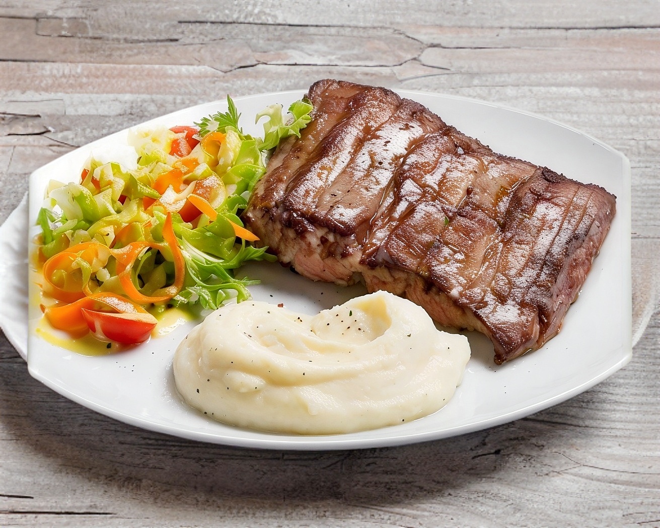 acompañada de pure de papa y ensalda, con un pedazo de carne (cruda250gr)