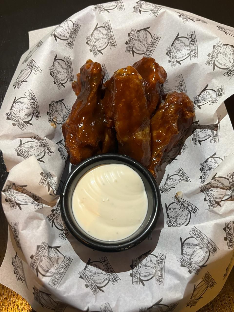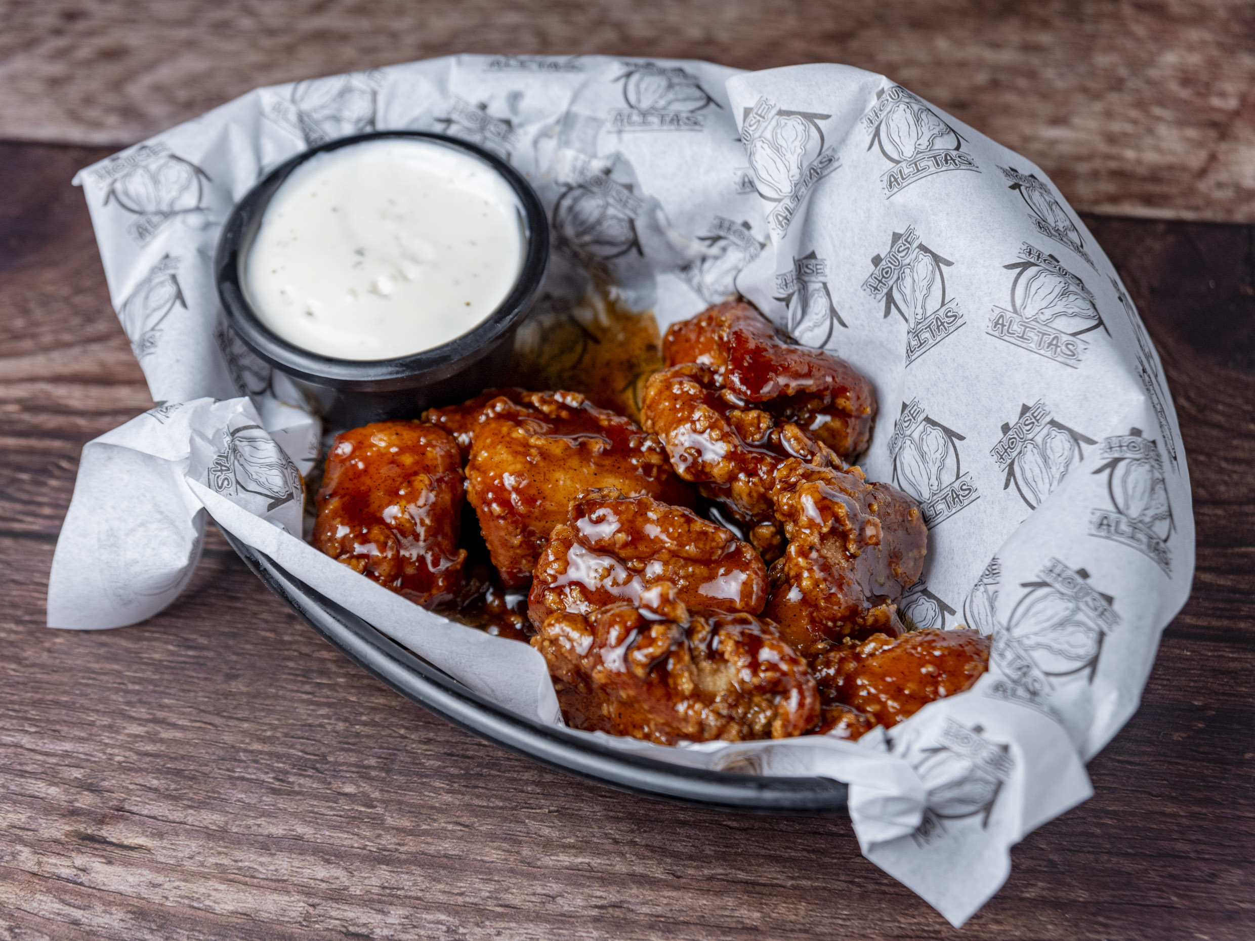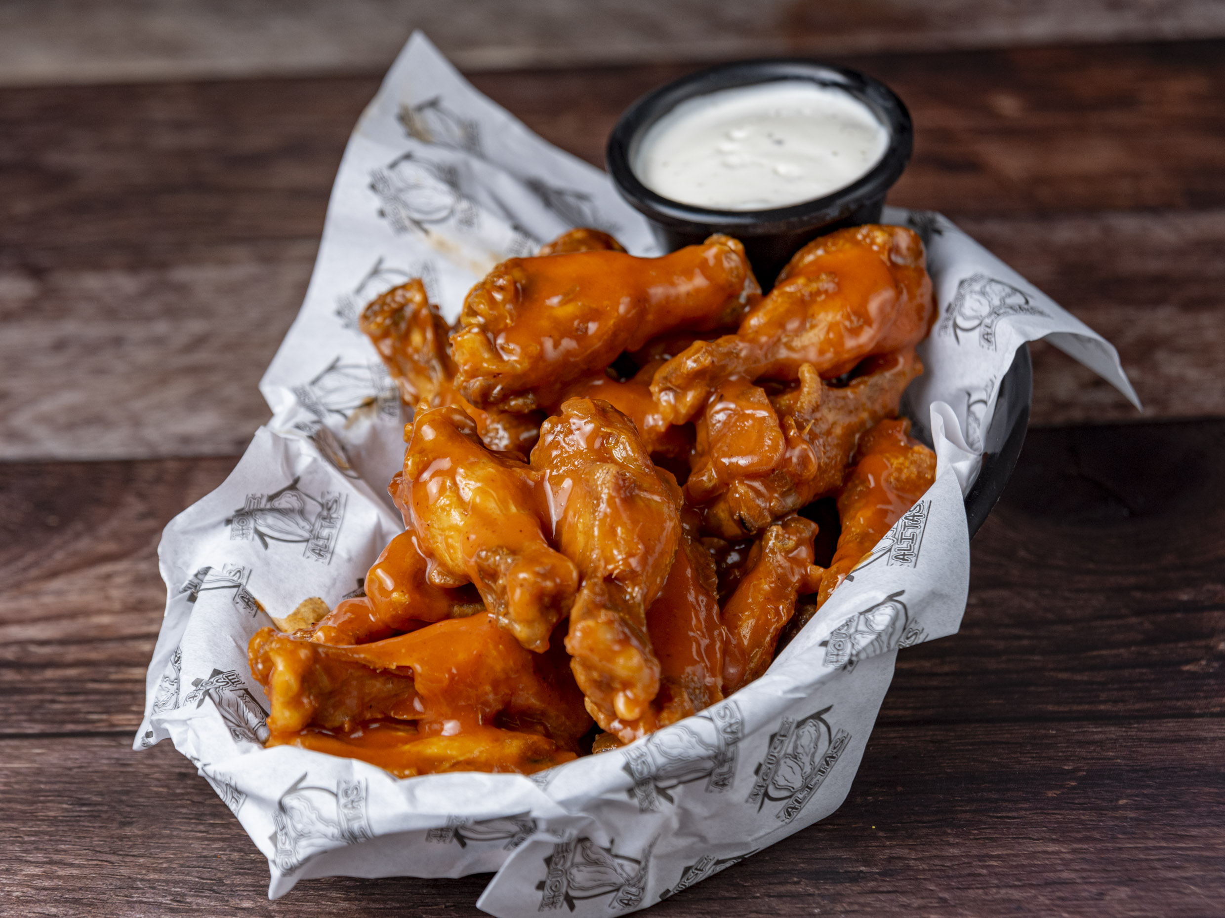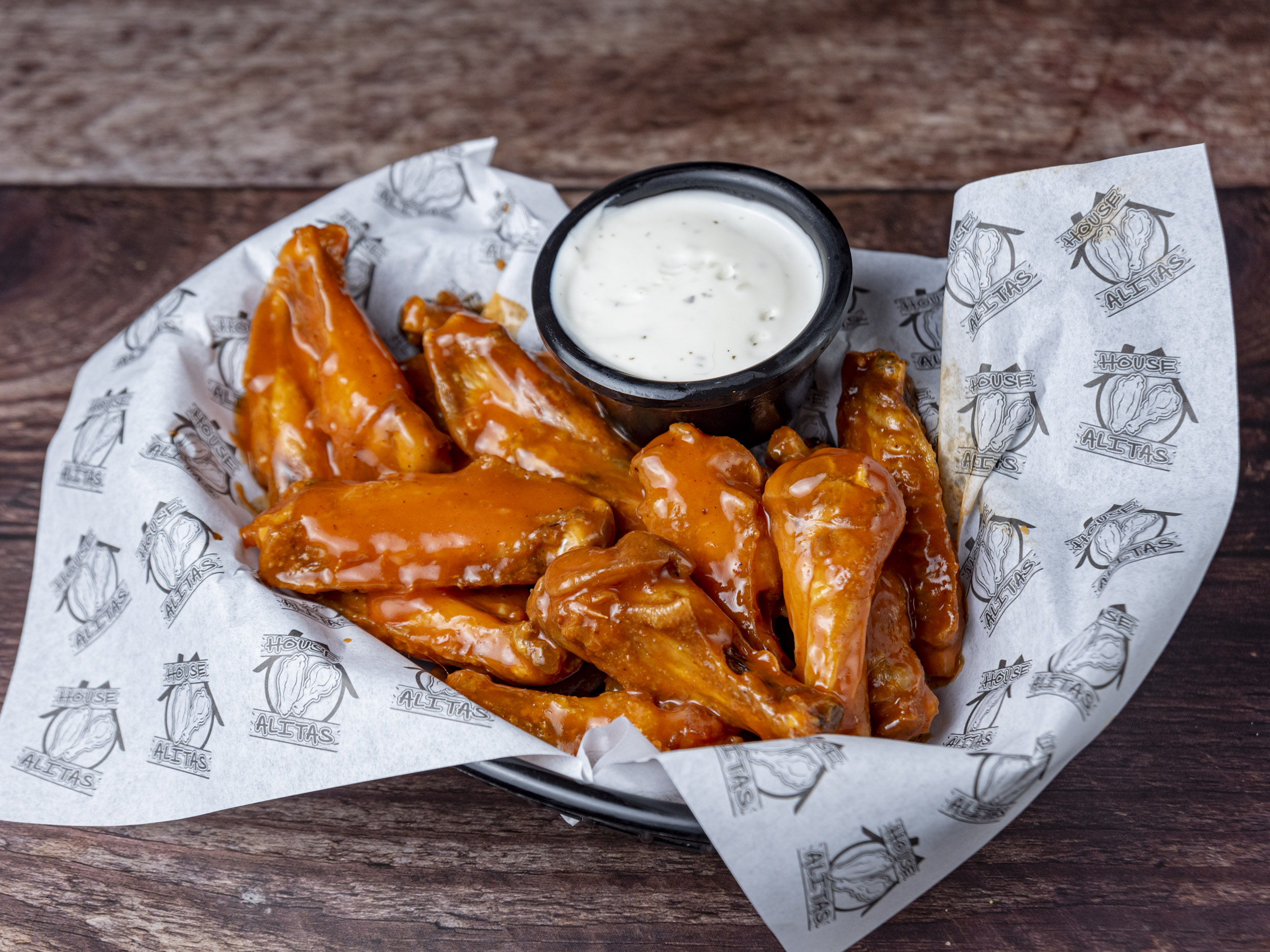 Alitas de pollo fritas con eleccion a 19 sabores.Ala tamaño Gde.