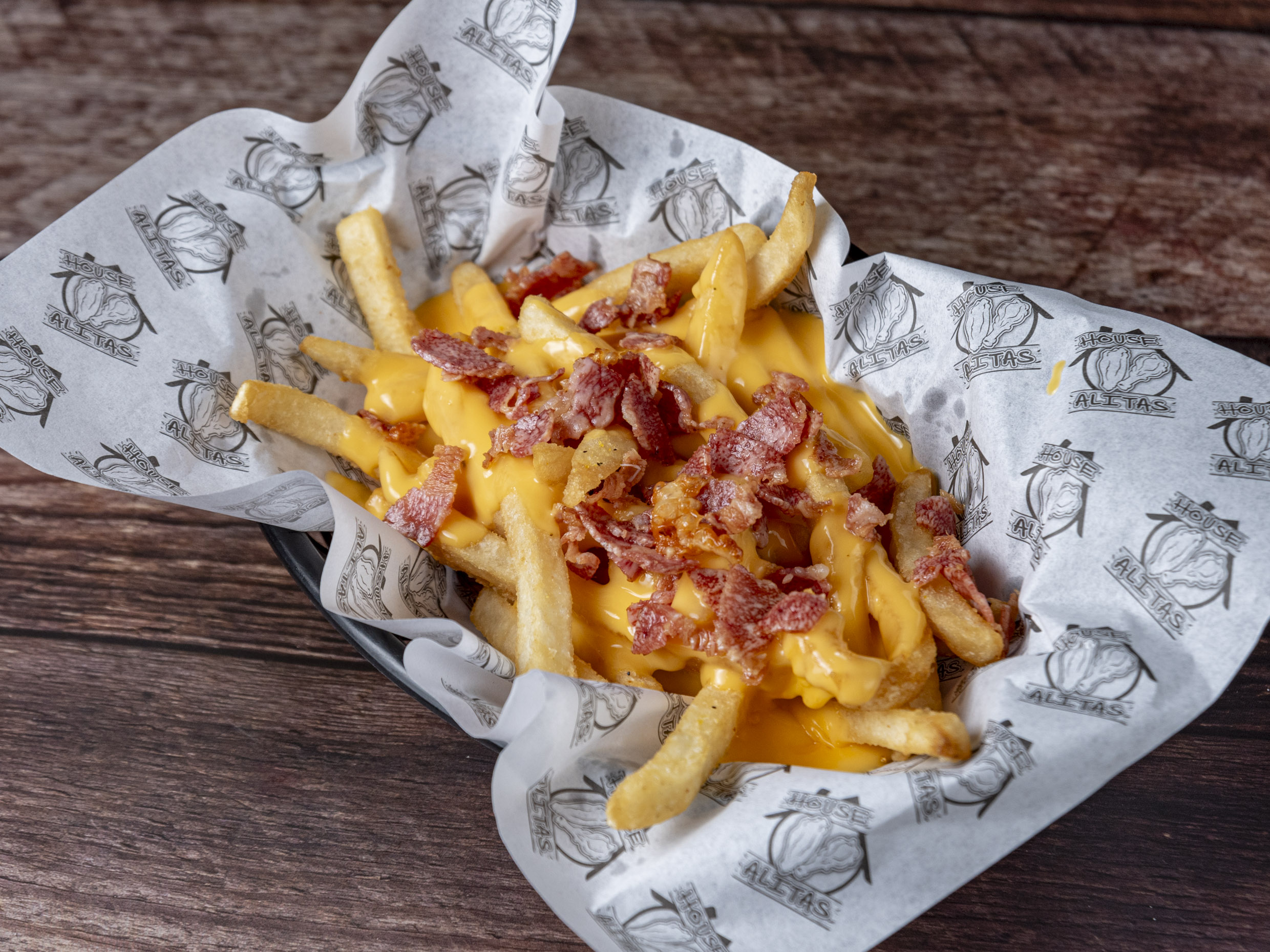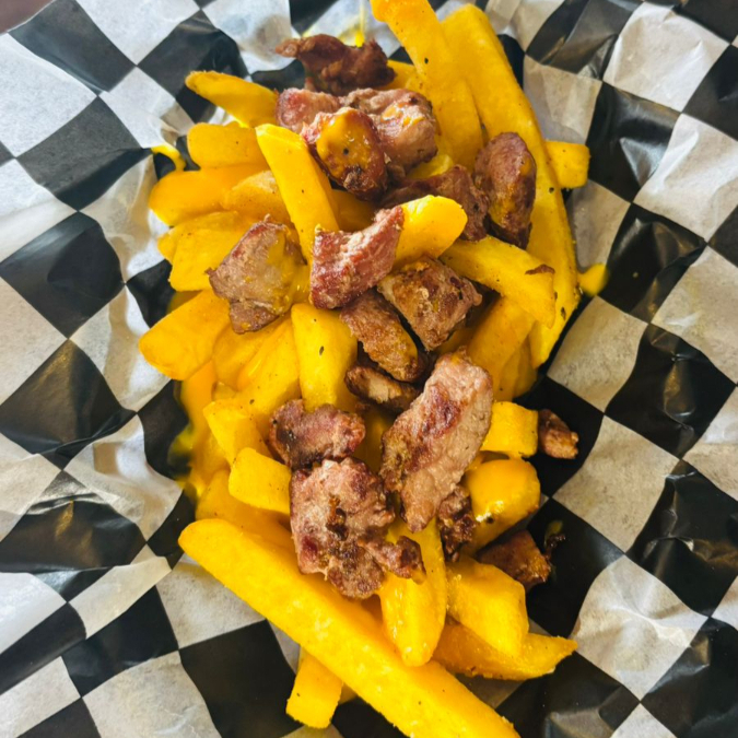 papas francesas bañadas con queso amarillo y toping de tocino crujiente