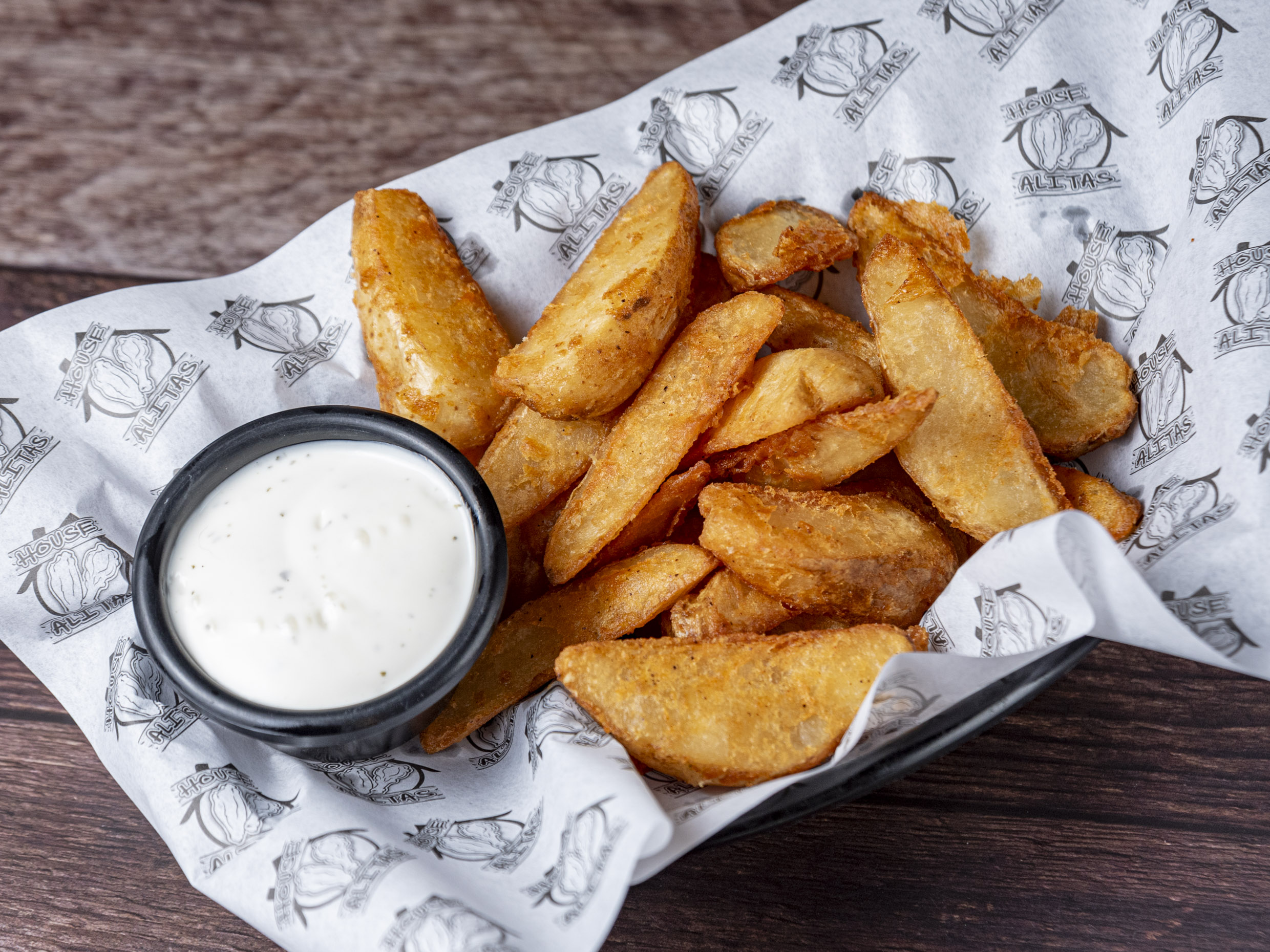 papas cortadas en gajo acompañadas con ranch