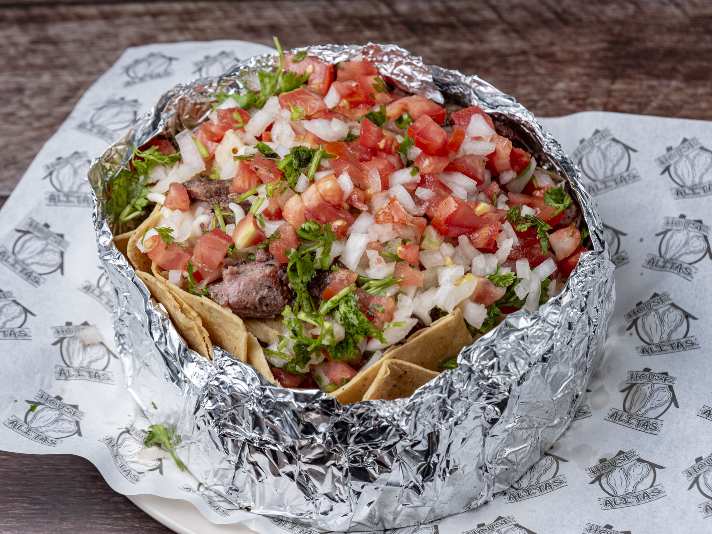 totopos acompañados de arrachera y un rico pico de gallo.