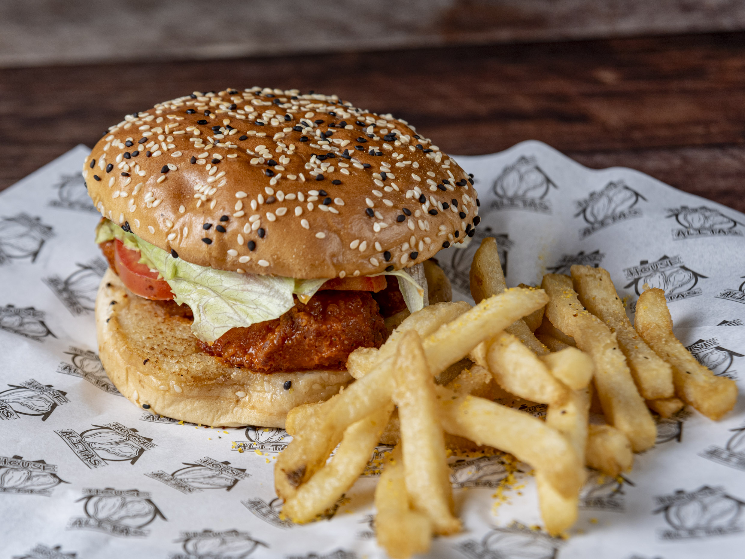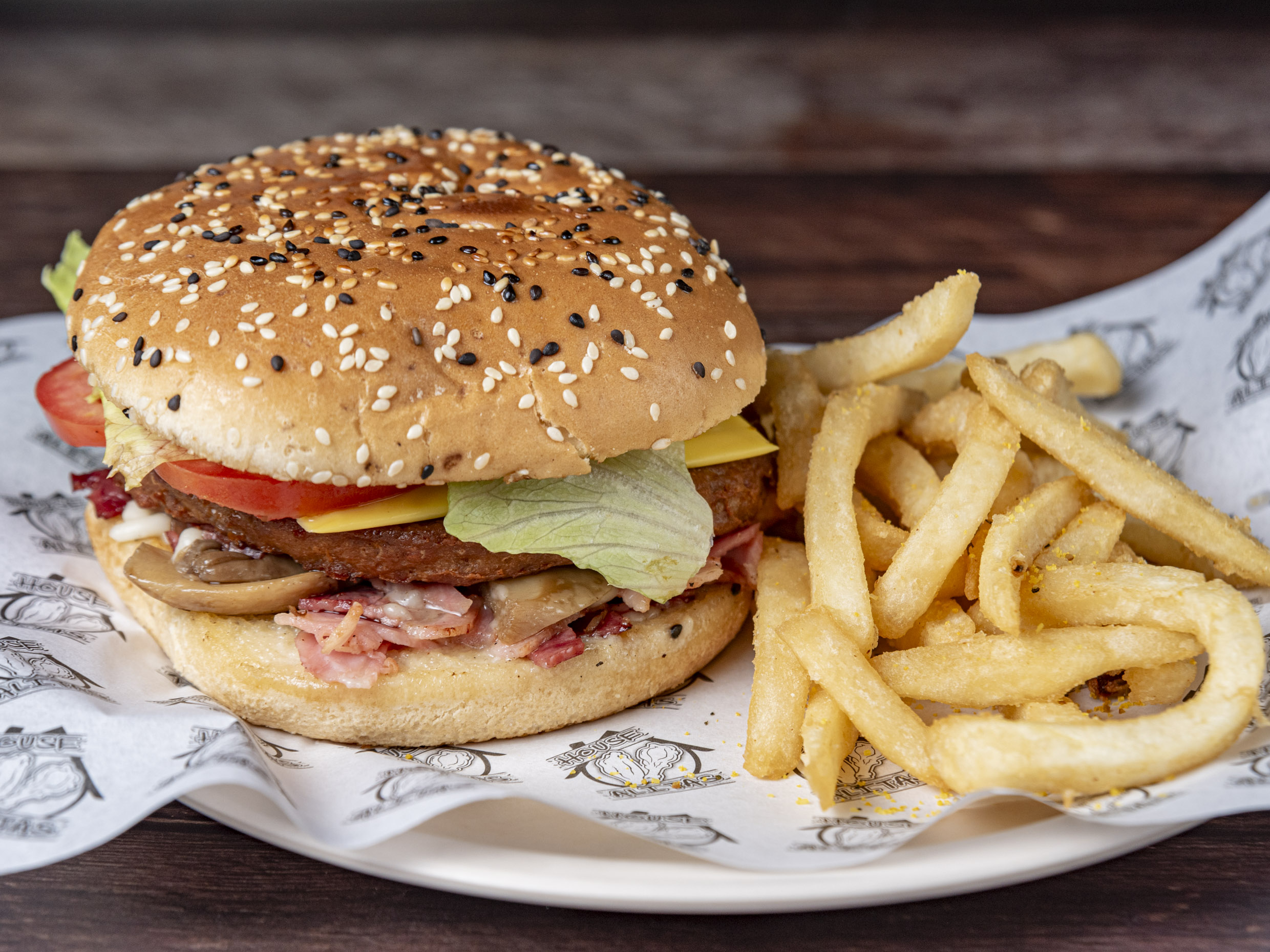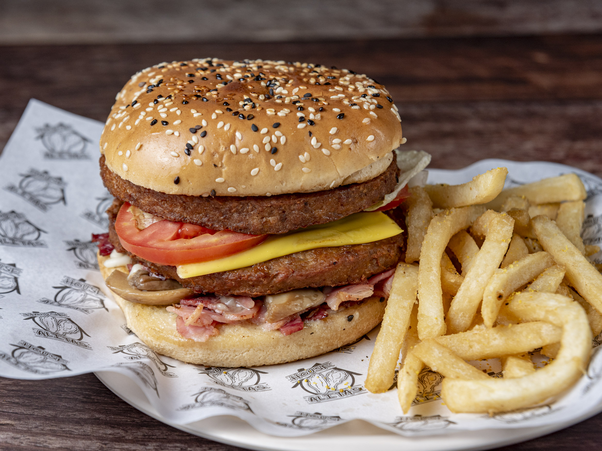 hamburguesa con doble carne de arrachera 150gr cada una, queso amarillo, tocino, champiñono y mozarella, acompañada con papas a la francesa