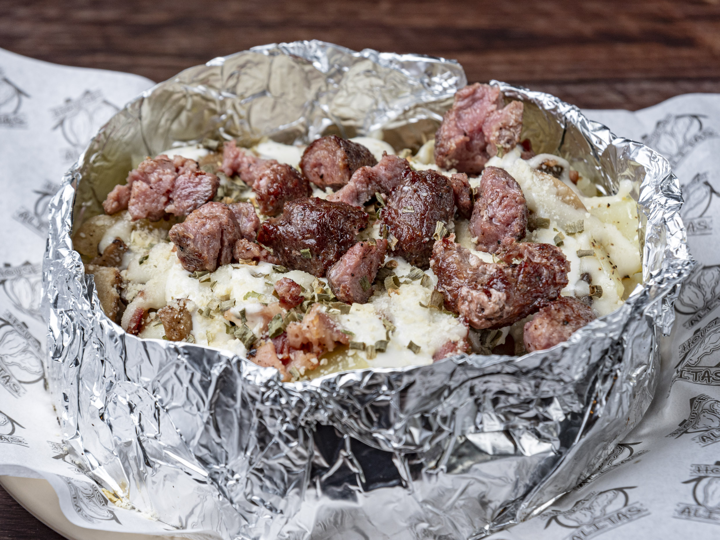 papa, tocino, champiñon,mozarella y arrachera bañada de ranch y cebollin