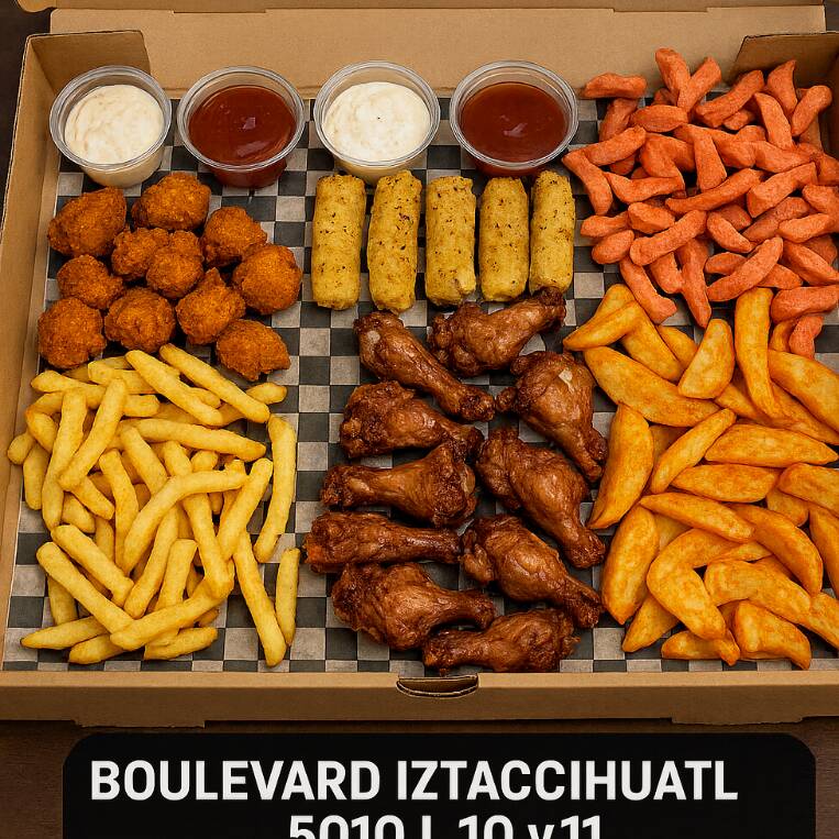 Alitas 12 Pzs*1 + Boneless 250 G. Promo Hot 🔥*1 + Papas ala Francesa*1 + Papa Gajo*1 + Salchipulpos Promo Hot 🔥*1 + Dedos de Queso*1 + Dip Catsup*2 + Búfalo Ranch*2