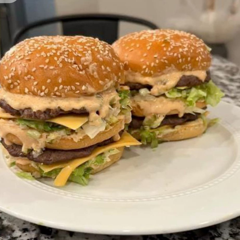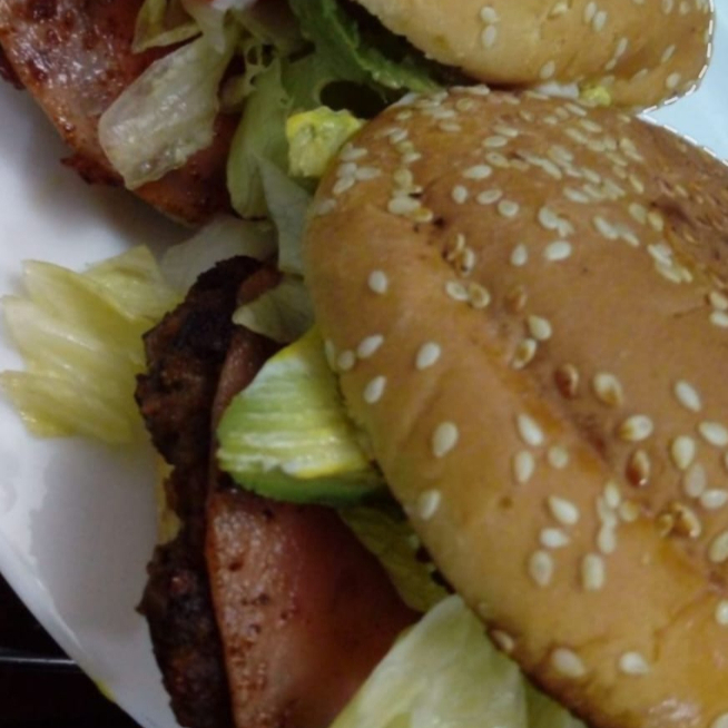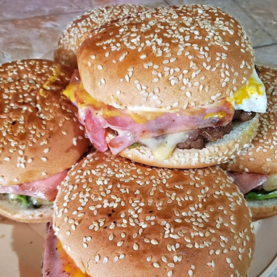 Pan, dos carnes jugosas con tocino, queso amarillo, queso, blanco, jamon, piña, jitomate, lechuga, cebolla, catsup, crema, mayonesa, mostaza, chile.