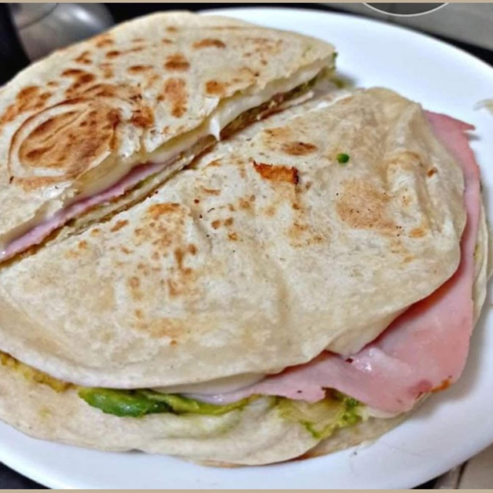 Dos Tortillas de harina, con queso mozzarella, jamon, cebolla, jitomate, lechuga