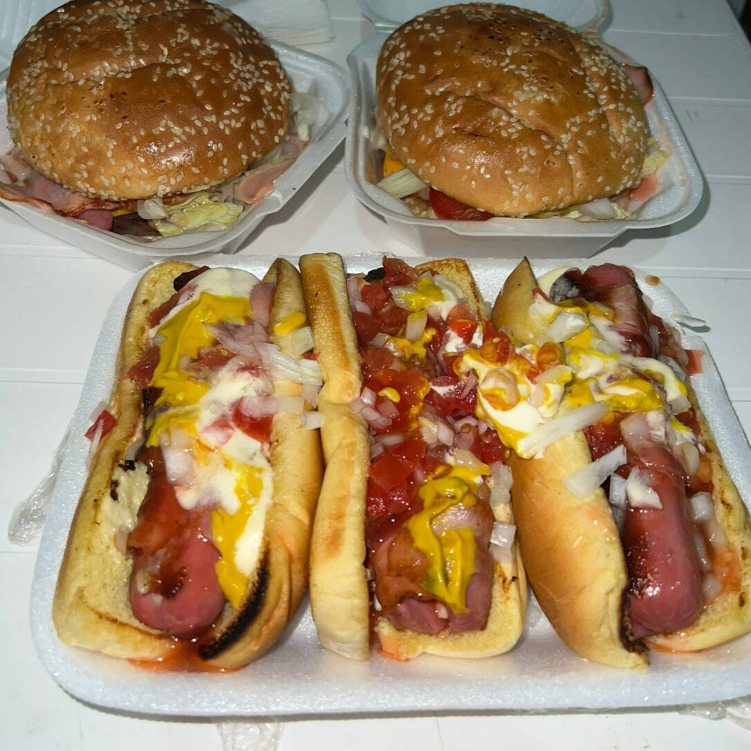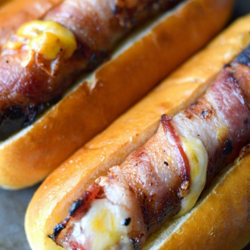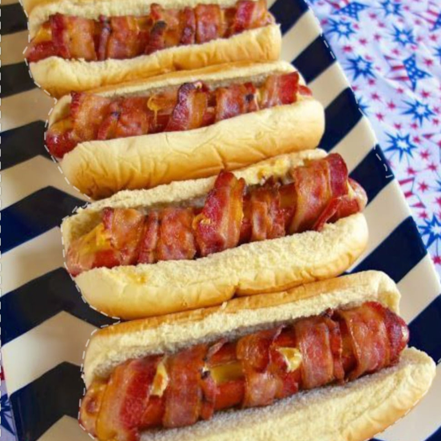 3 hot dog con queso mozzarella, envuelto con tocino, jitomate, cebolla, captsu, crema, mayonesa, mostaza.
