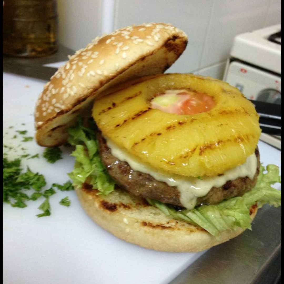 Pan, carne jugosa con tocino, Queso blanco, 3 rebanadas de piña, jitomate, cebolla, lechuga, catsup, mayonesa, crema, mayonesa.