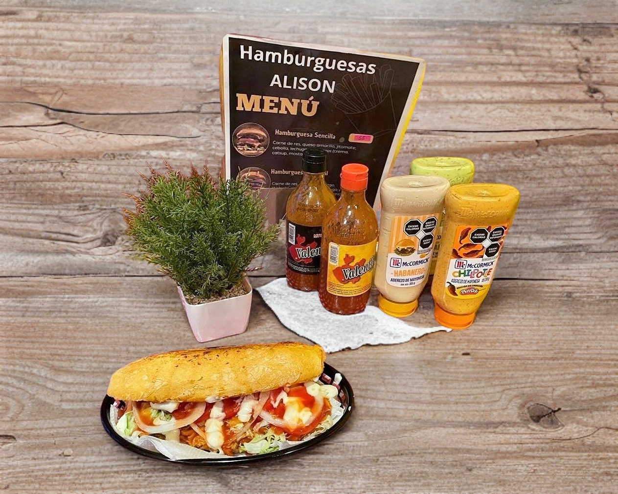 Momia : son dos tortillas de harina con jamon ,dos rebanadas de queso amarillo ,salchicha y media de pavo envueltas con tocino,se le agrega verdura (lechuga, jitomate y cebolla) aderezos al gusto (crema, catsup y mostaza)
