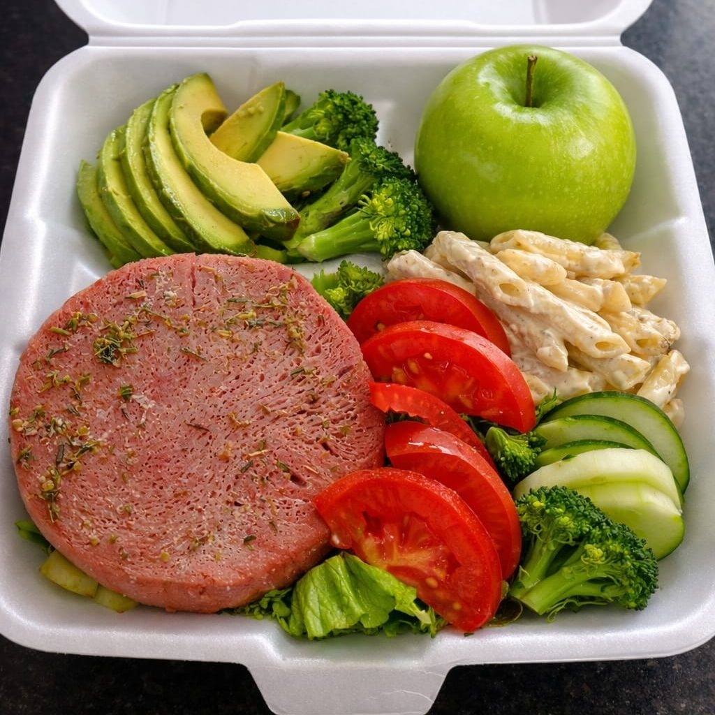 Ensalada fresca con atún premium (200 g), acompañada de una mezcla equilibrada de vegetales: lechuga fresca, jitomate, pepino, brócoli al vapor, aguacate y manzana verde. Incluye una porción de pasta corta cremosa como acompañamiento para mayor saciedad. Ideal para una comida completa, alta en proteína y bien balanceada.