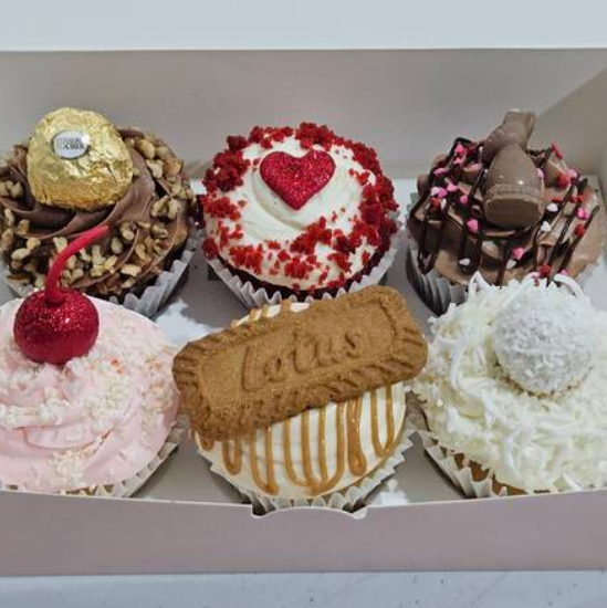 Caja de cartón rosa con 6 deliciosos cupcakes, puedes elegir los que más te gusten.