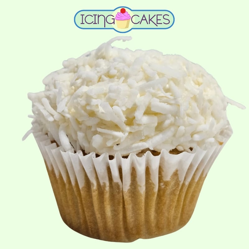 Pan de vainilla con coco, relleno de crema pastelera y decorado con betún de queso Philadelphia y coco blanco.