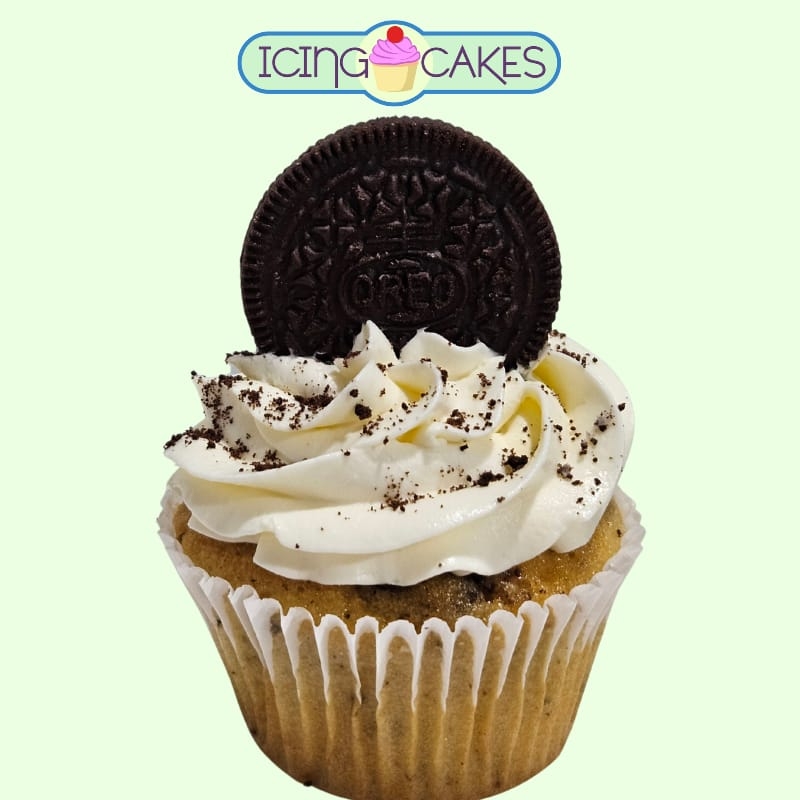 Pan de vainilla con trozos de Oreo, relleno de crema pastelera de chocolate, decorado con betún de queso Philadelphia y galleta Oreo.