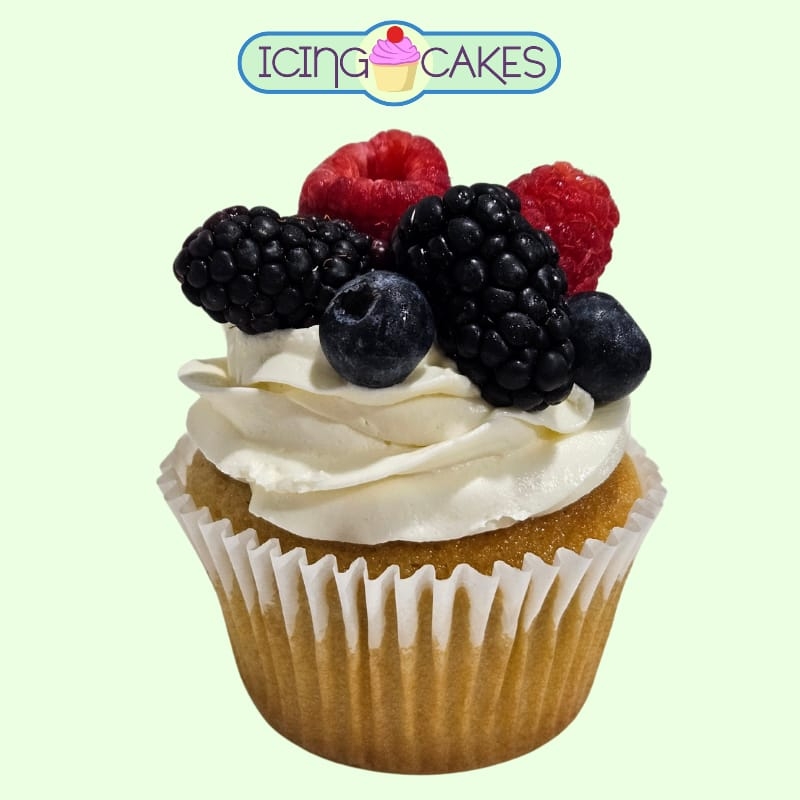 Pan de vainilla, relleno de betún de queso Philadelphia y mermelada de frutos rojos, decorado con betún de queso Philadelphia y frutos rojos frescos.