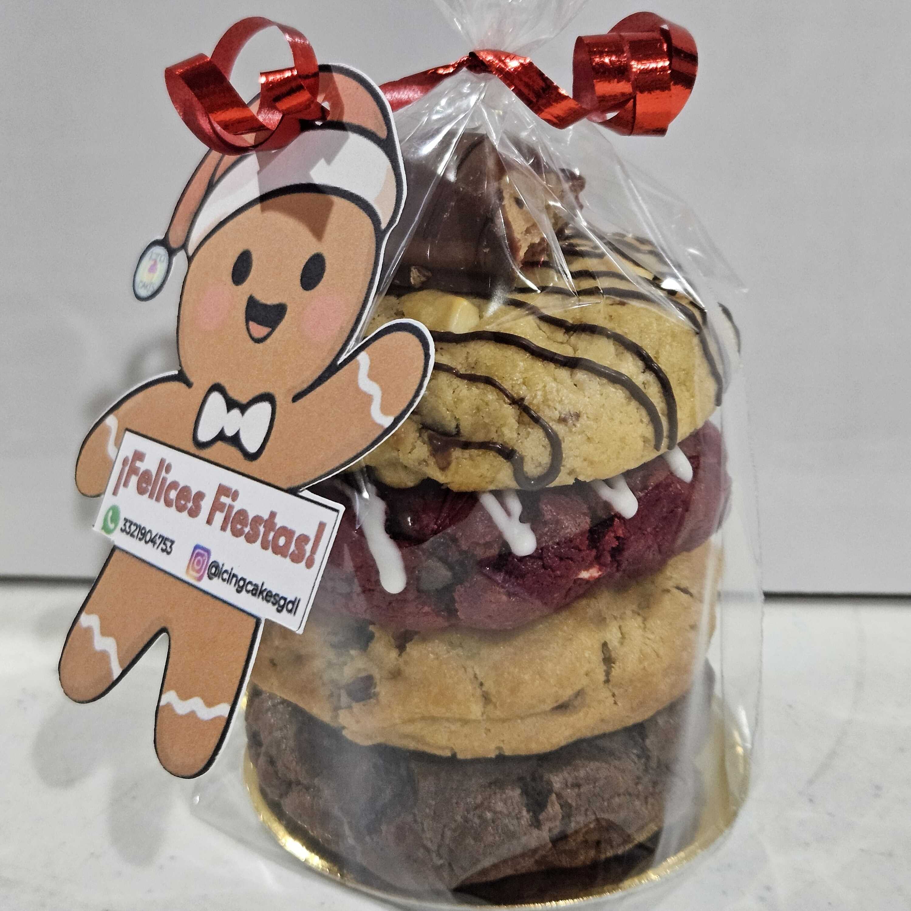 Contiene 4 galletas: kinder, chocochips, red velvet, chocolate