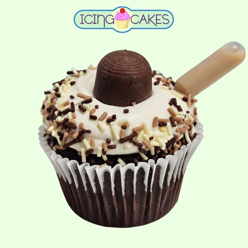 Pan de chocolate, relleno de crema pastelera de chocolate con un toque de Baileys, decorado con betún de queso Philadelphia con un toque de Baileys, chispas de chocolate, un chocolate relleno de Baileys y un shot de Baileys.