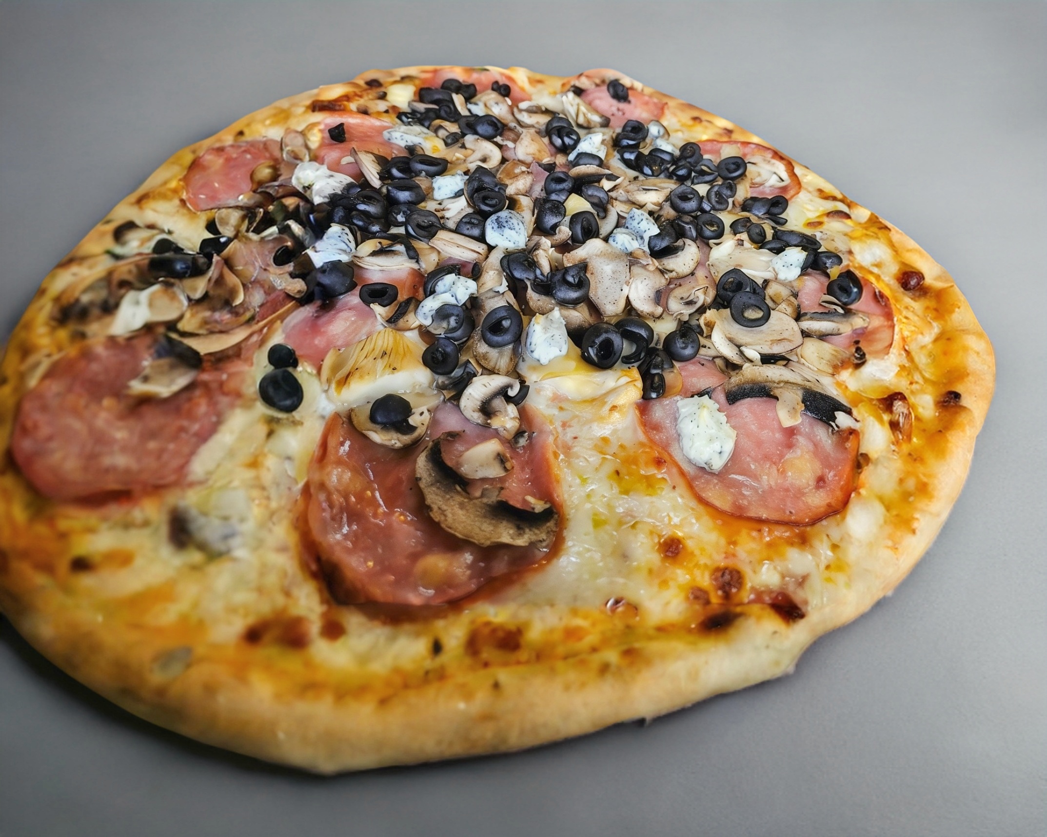 Pizza a la leña conSalami, aceituna negra, champiñón, queso de cabra y nuestra mezcla de quesos. 35cm