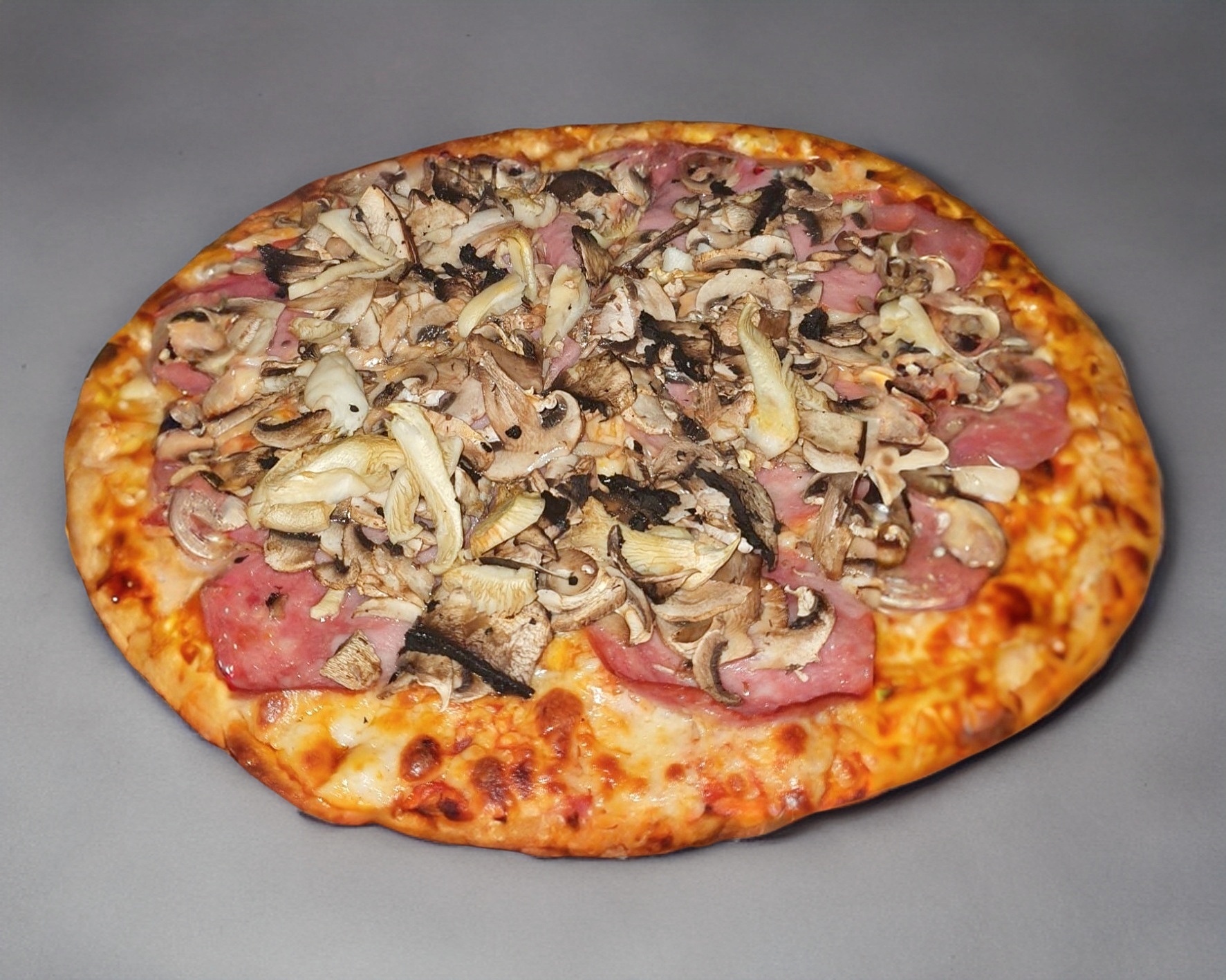 Pizza a la leña con nuestra mezcla de quesos, Champiñón, setas, portobello y salami. 35cm