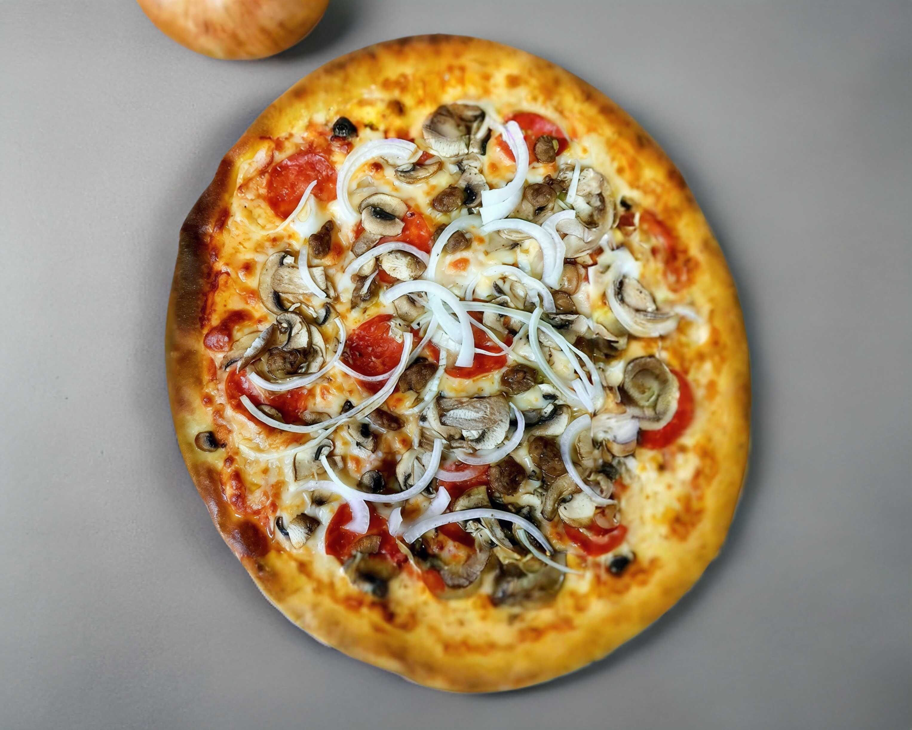 Pizza a la leña con mezcla de quesos, Salchicha italiana, cebolla, pepperoni y champiñon. 35cm