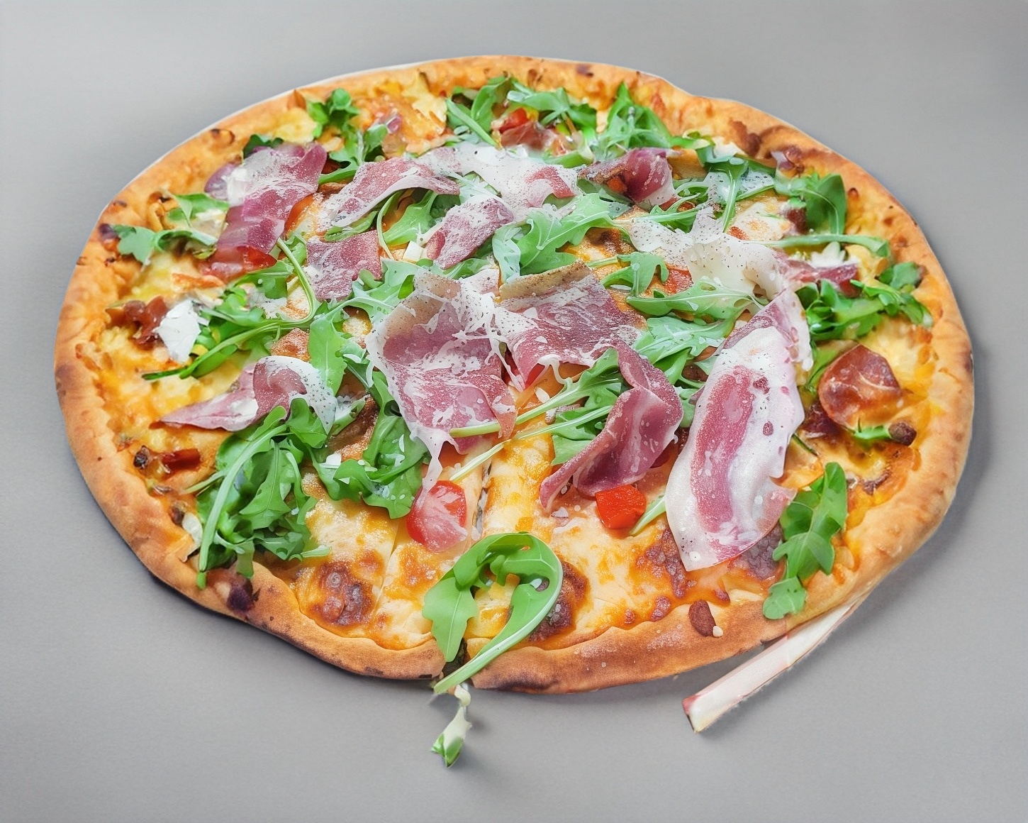 Jamón serrano, jitomate, arúgula, parmesano y aceite de oliva.