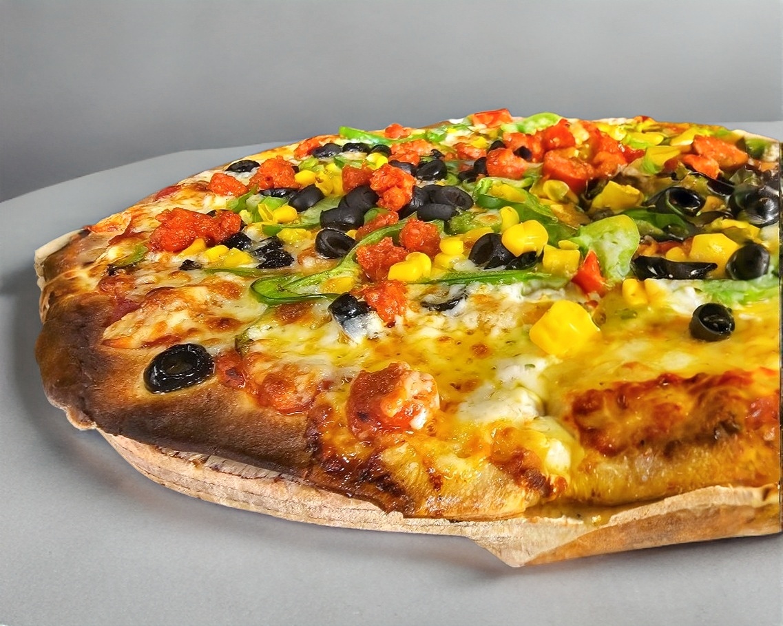 Pizza a la leña con Chistorra, pimiento, elote, aceituna negra y nuestra mezcla de quesos. 35 cm